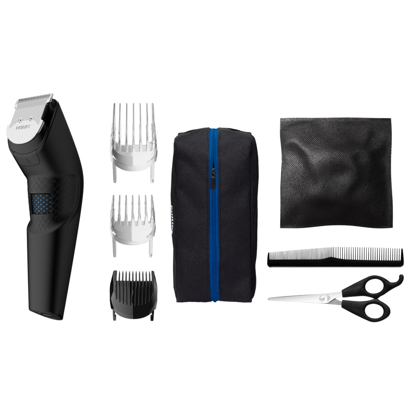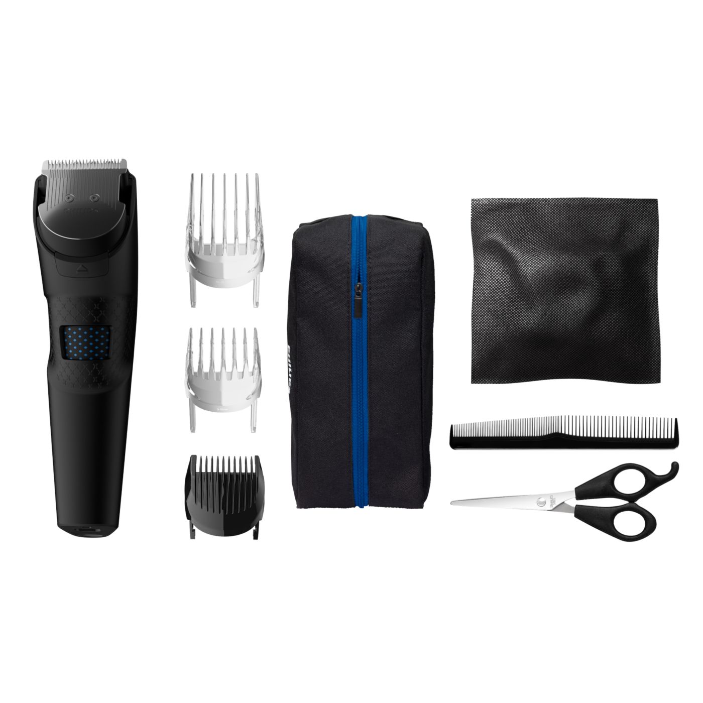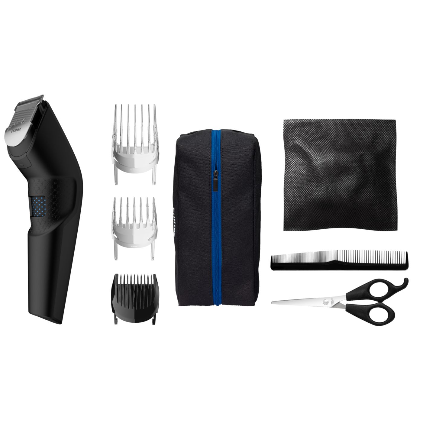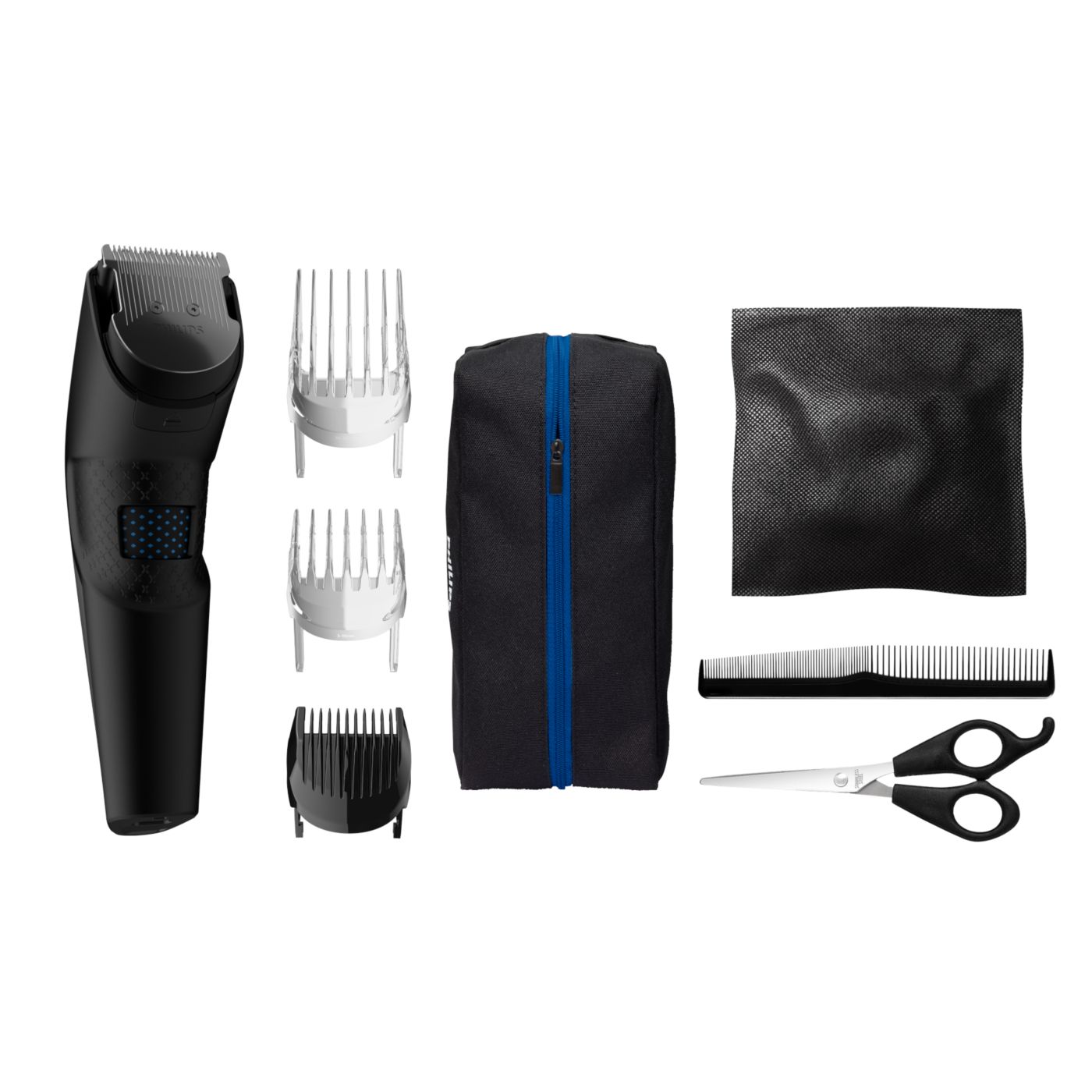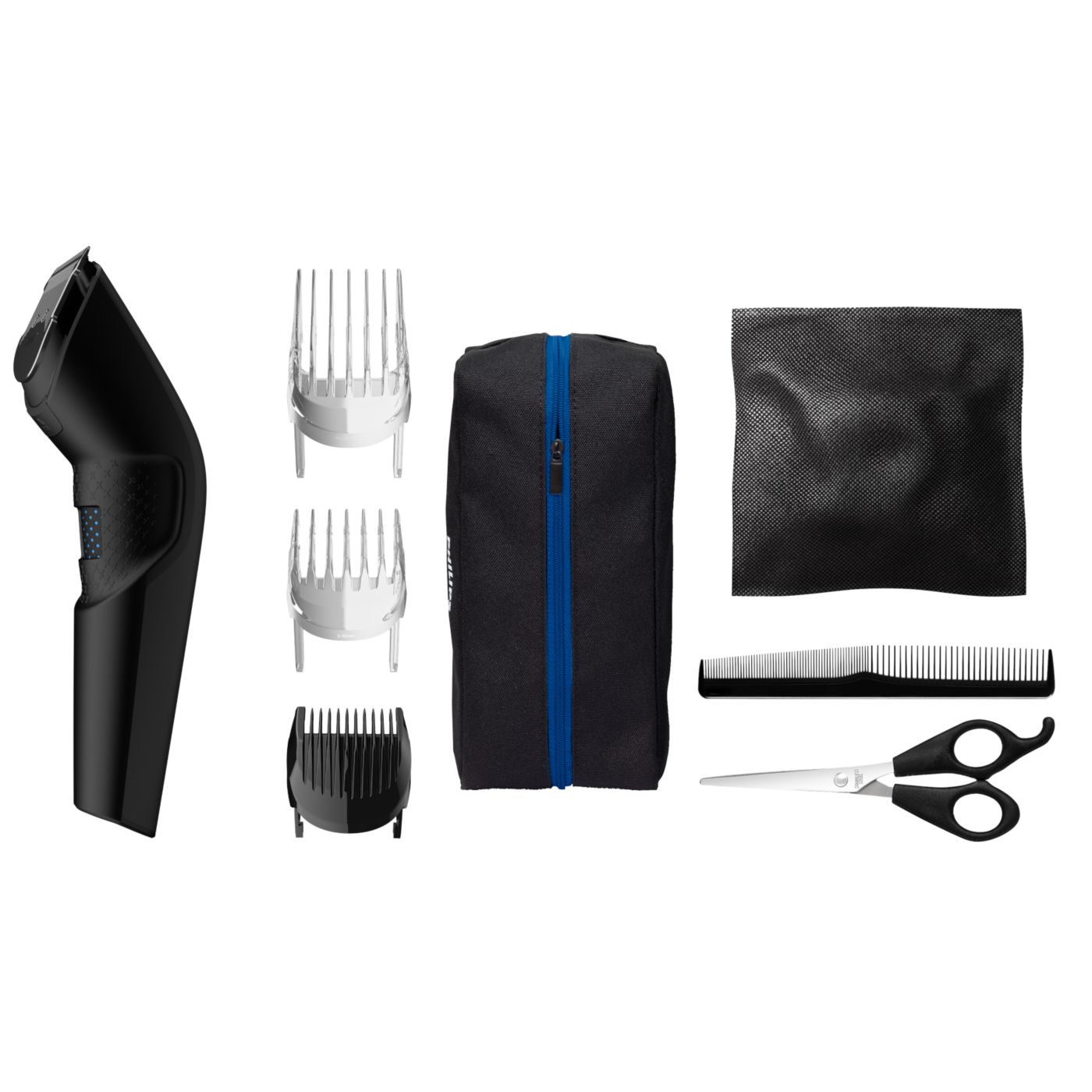 El kit de peluquería incluye tijeras, una boquilla con peine y una funda suave para organizar su cortadora y sus accesorios.