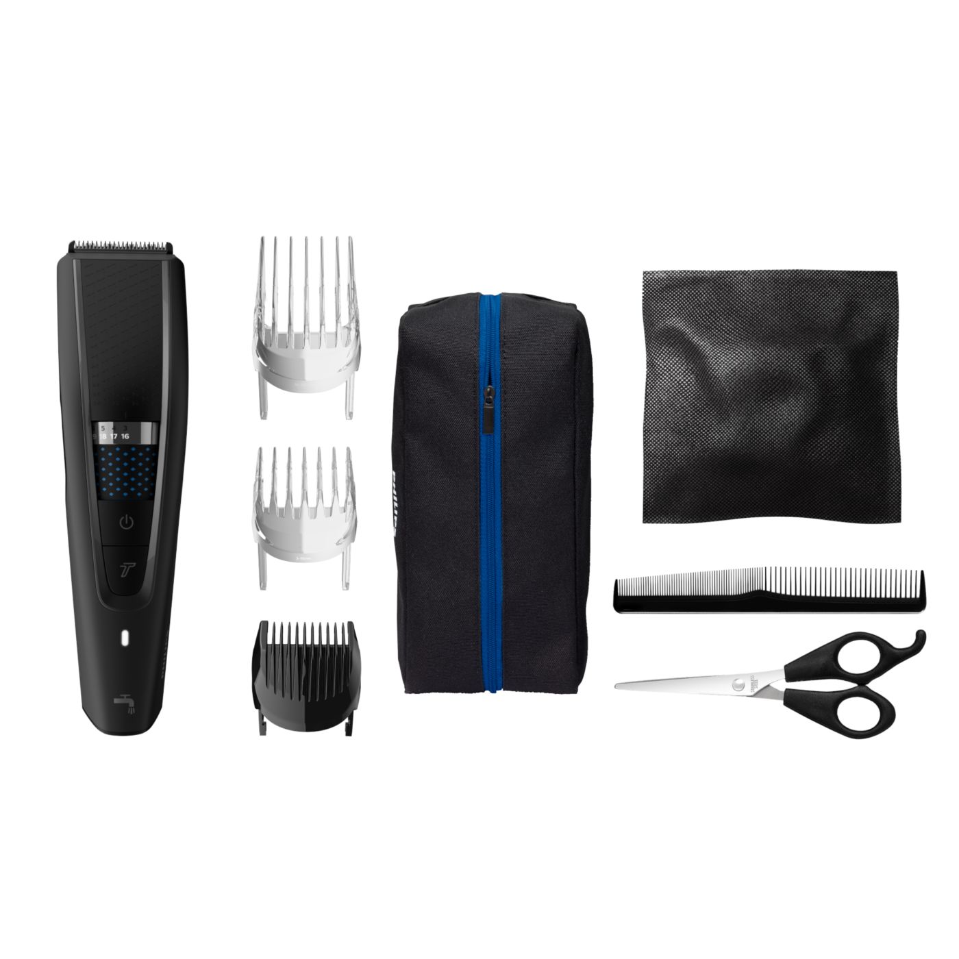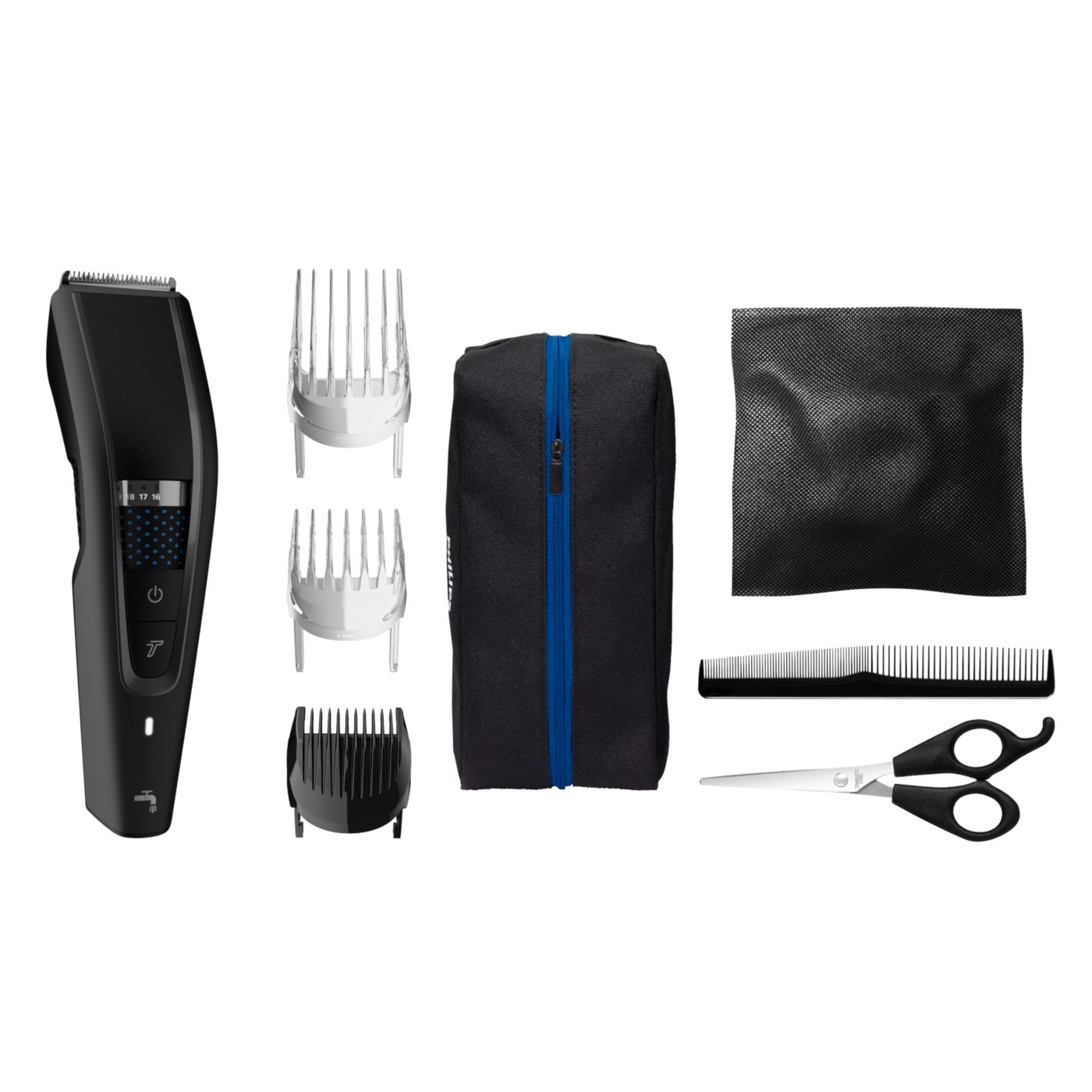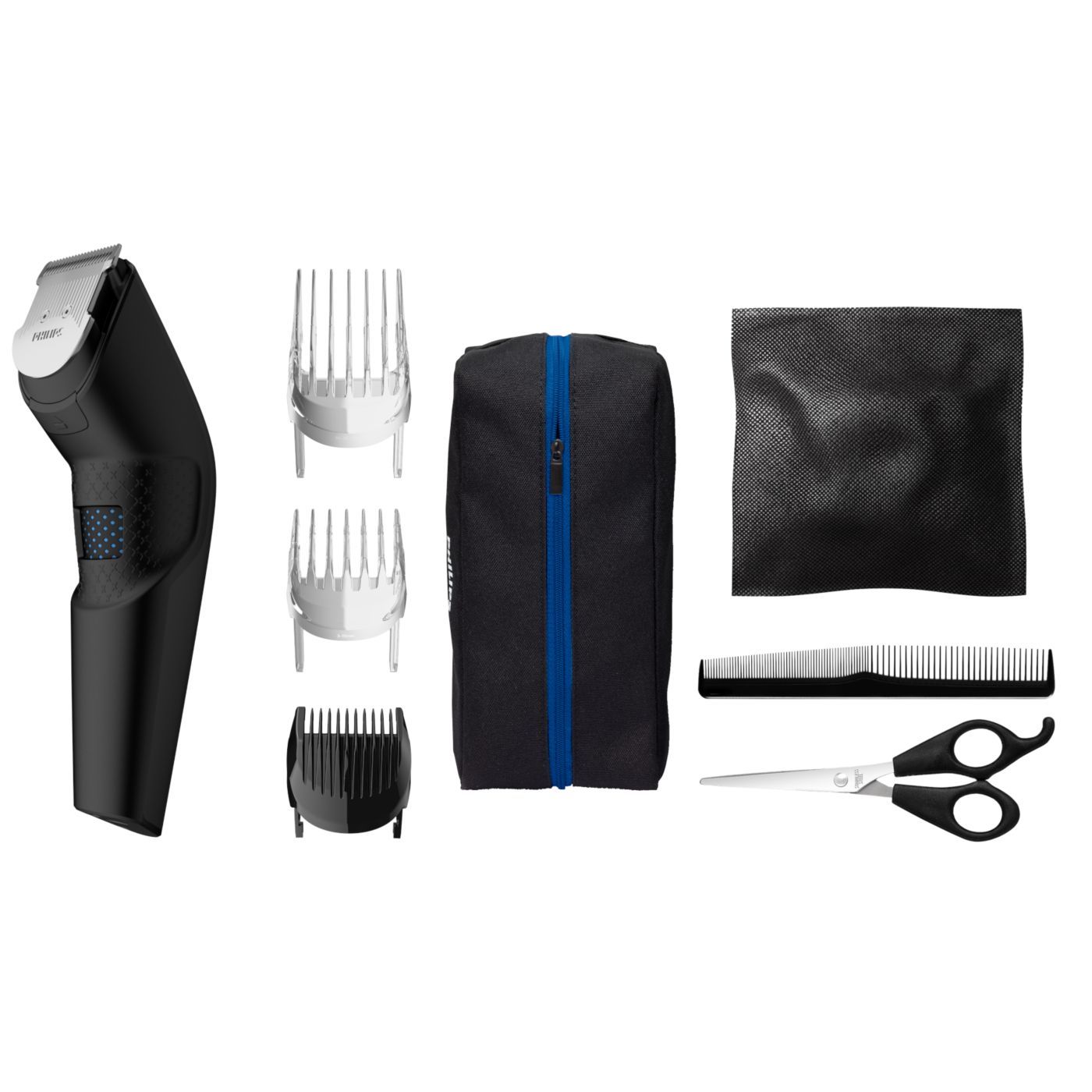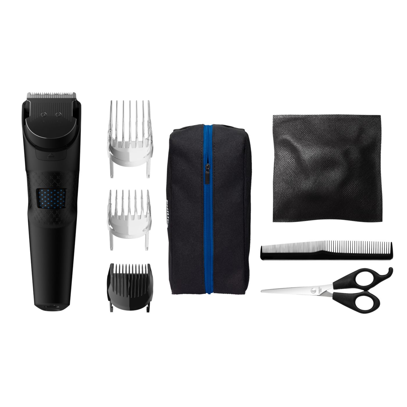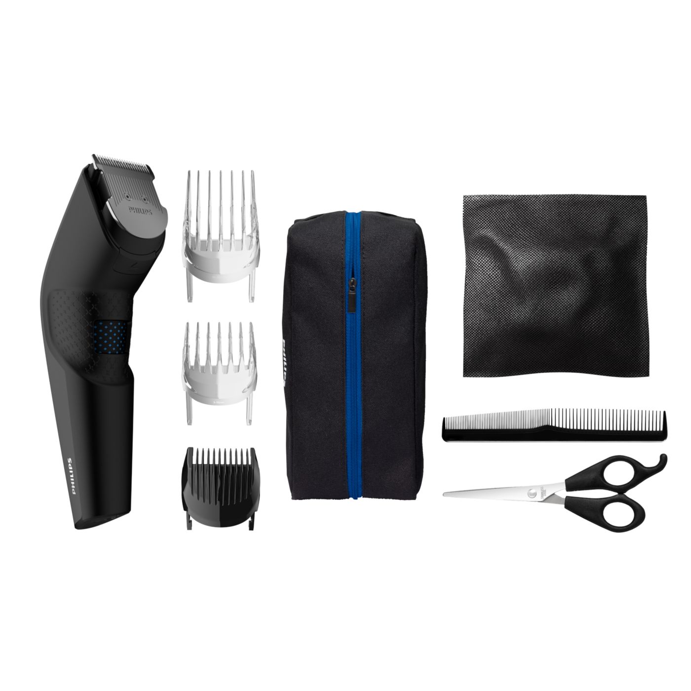 El kit de peluquería incluye tijeras, una boquilla con peine y una funda suave para organizar su cortadora y sus accesorios.