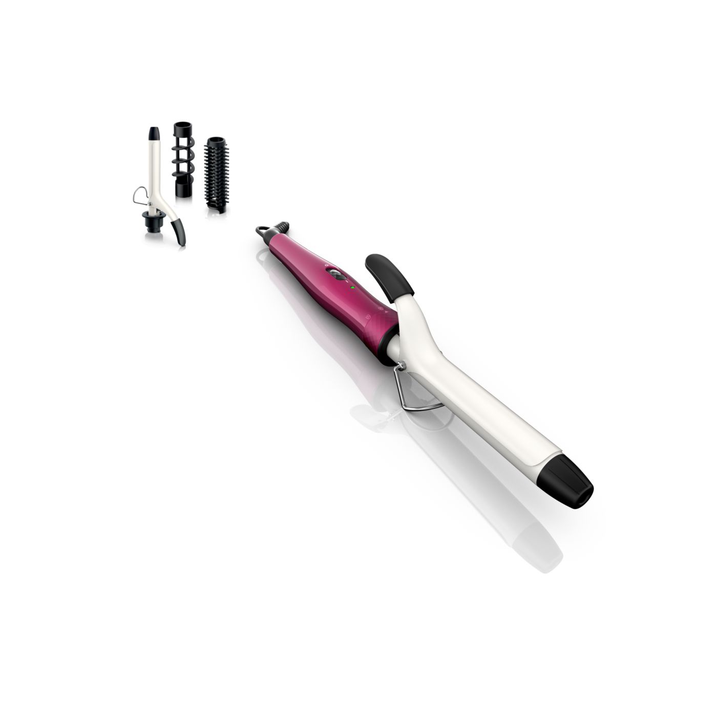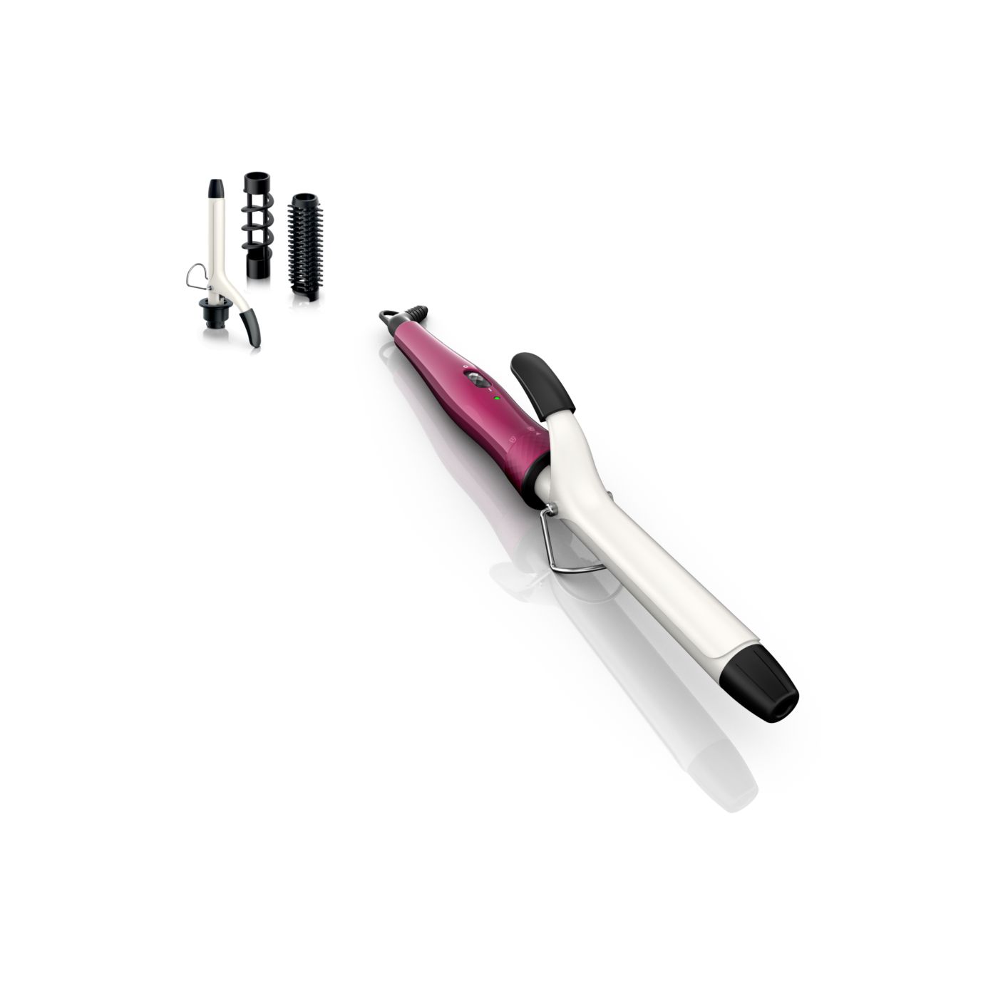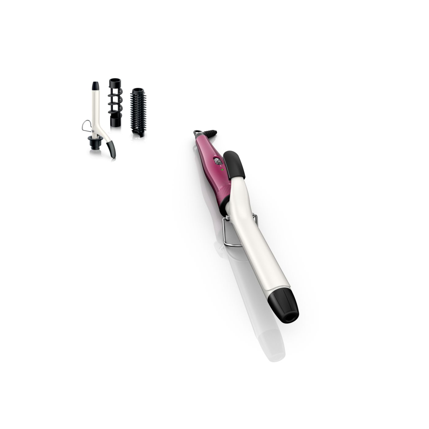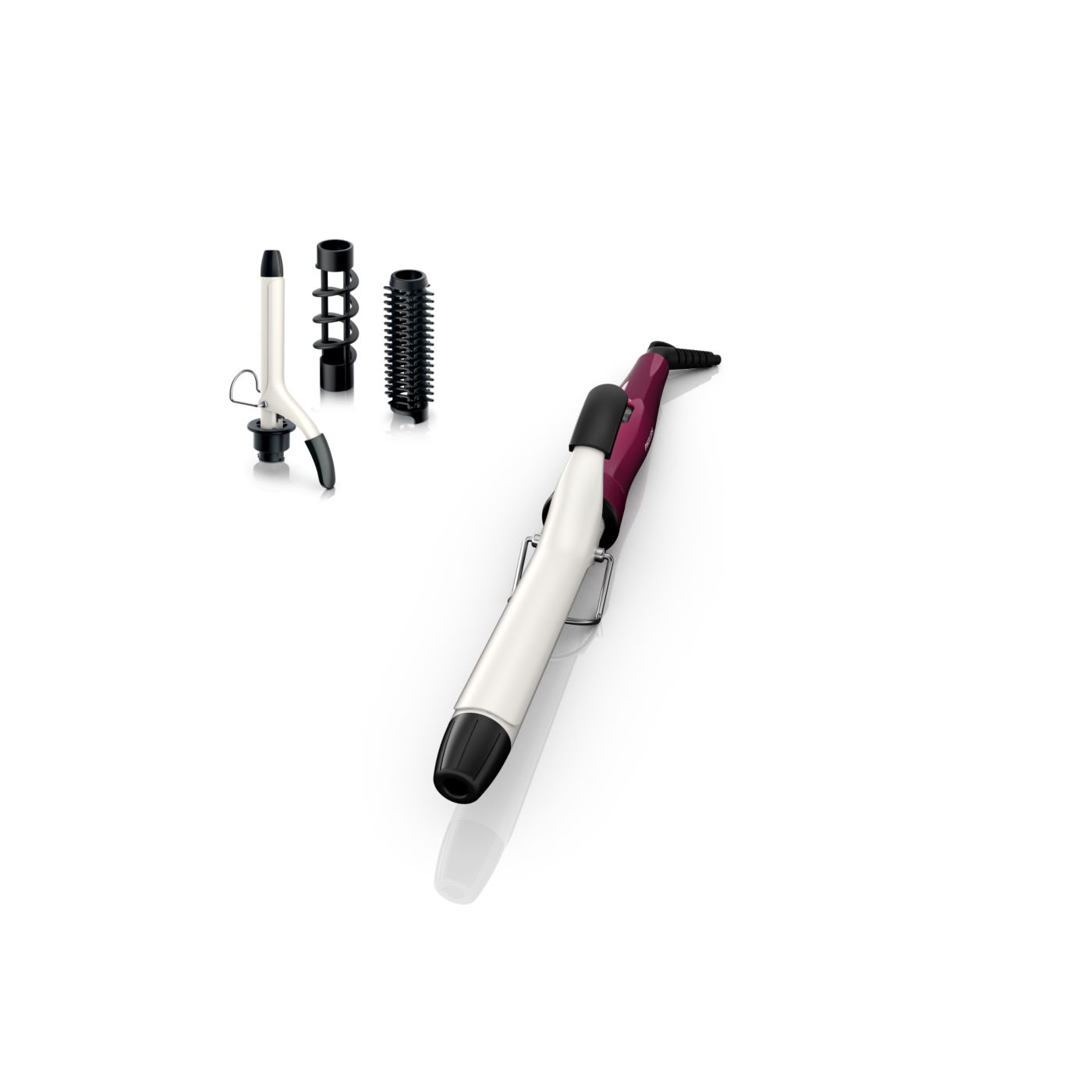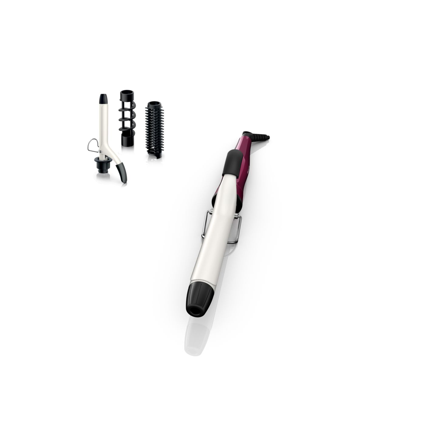El Multi-curler de Philips incluye: pinza de 16 mm para bucles, accesorio con cepillo para pinza de 16 mm para dar volumen adicional, pinza de 22 mm para rizar y accesorio con cepillo para crear rulos grandes y hermosas ondas.