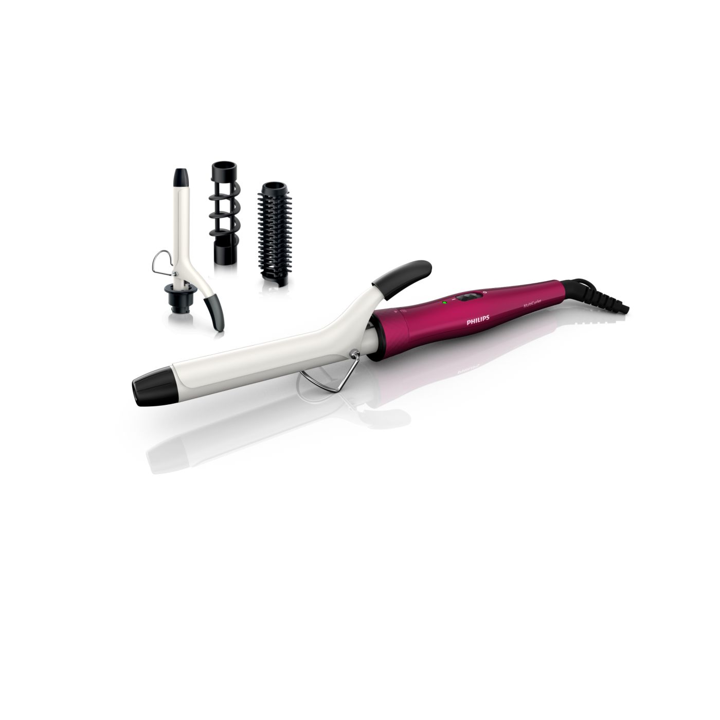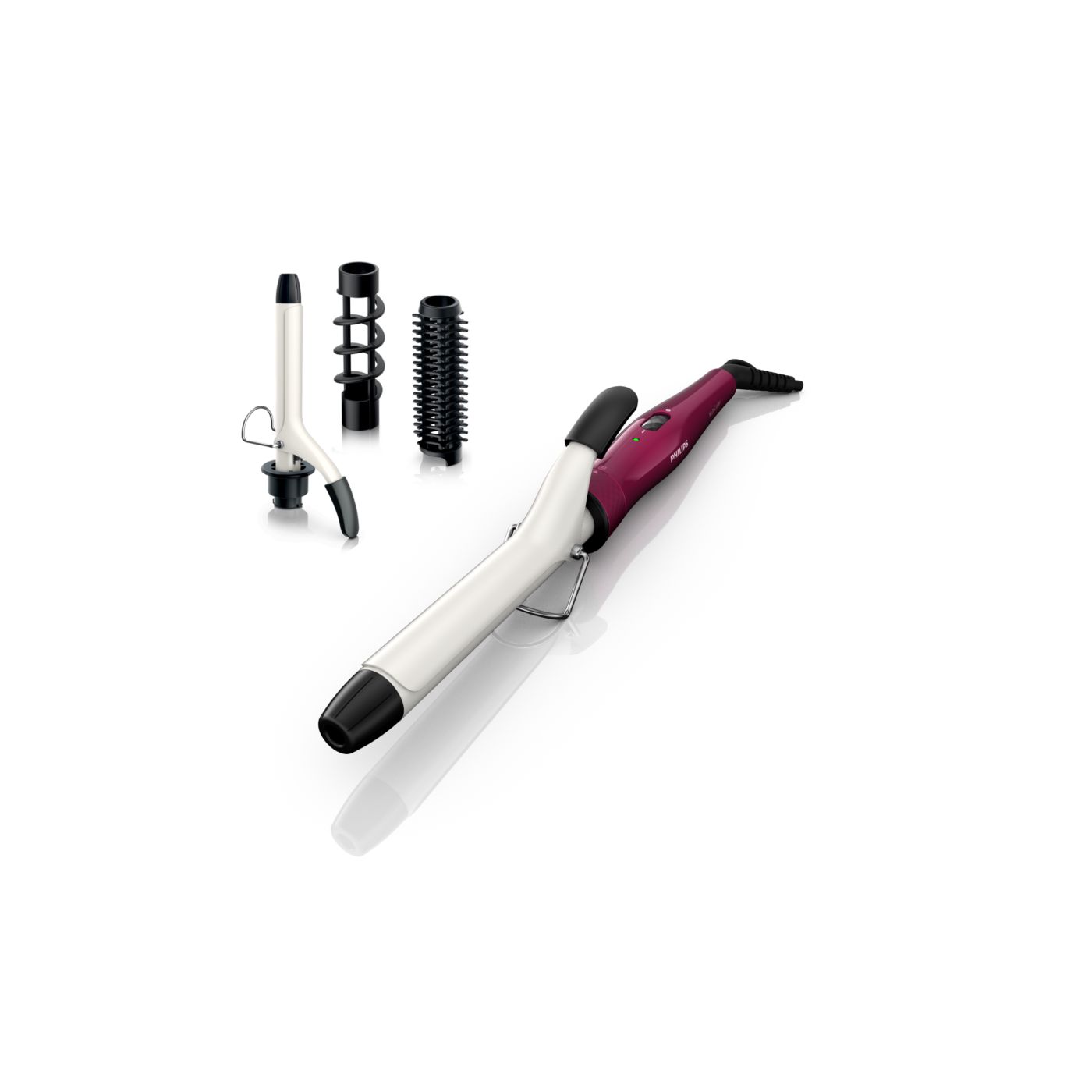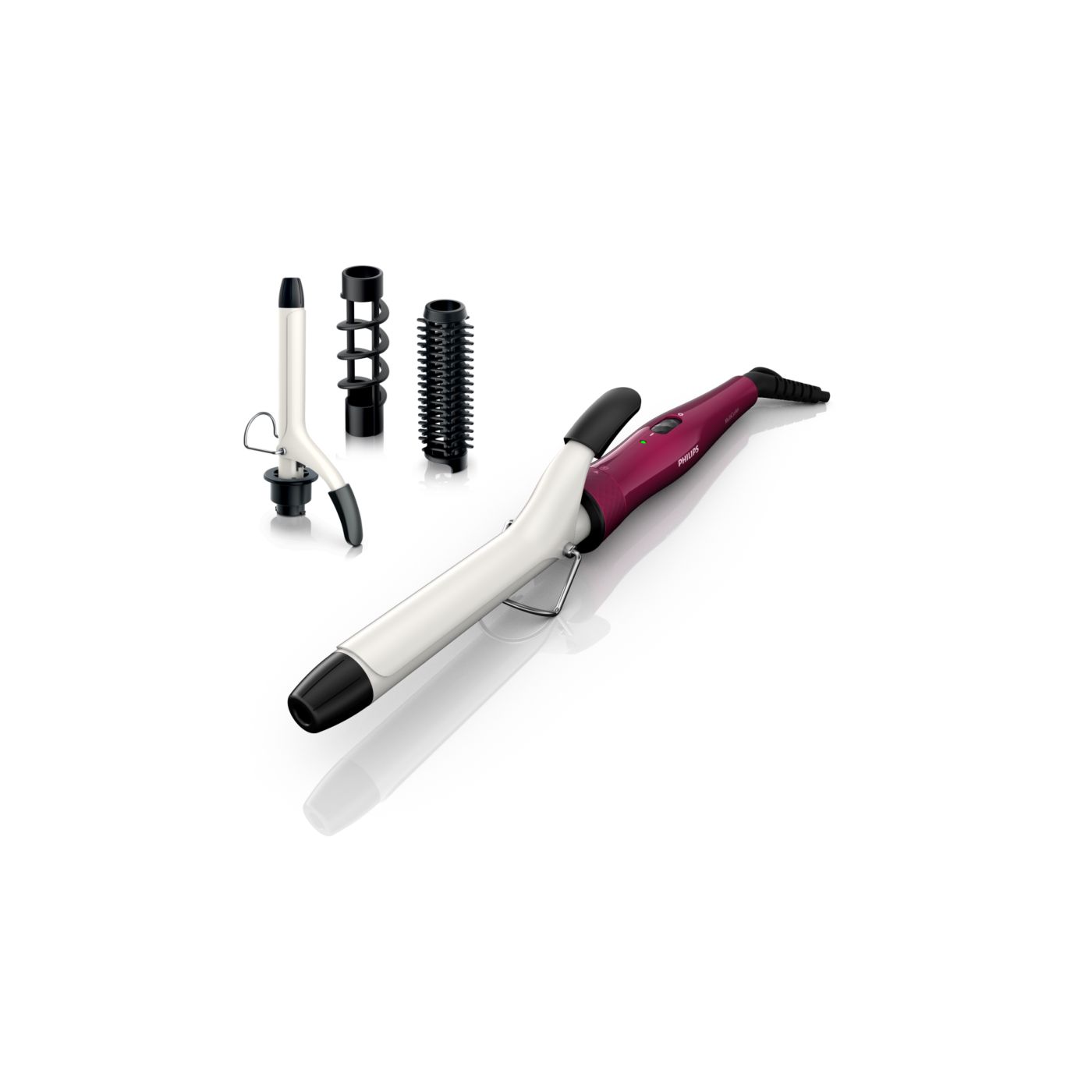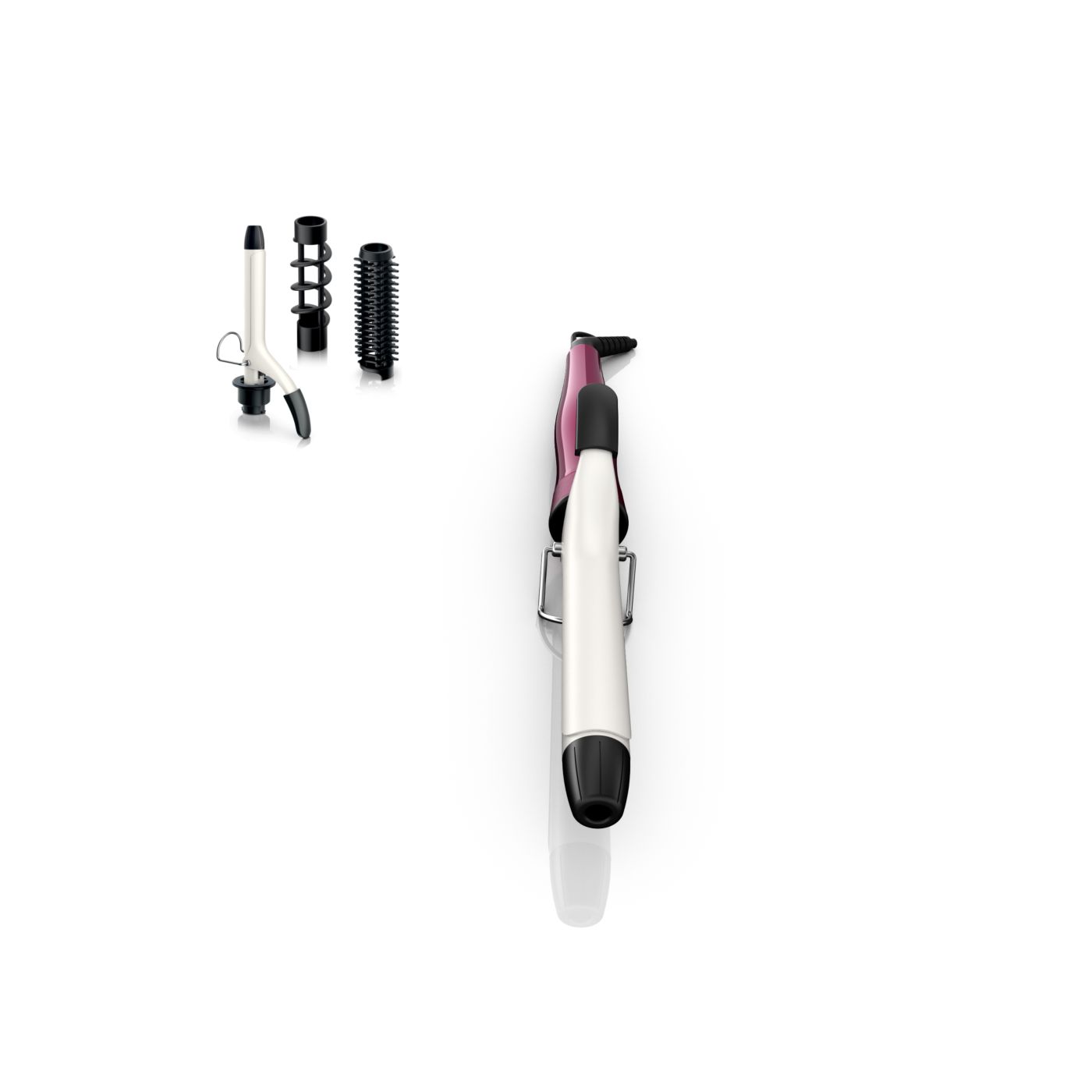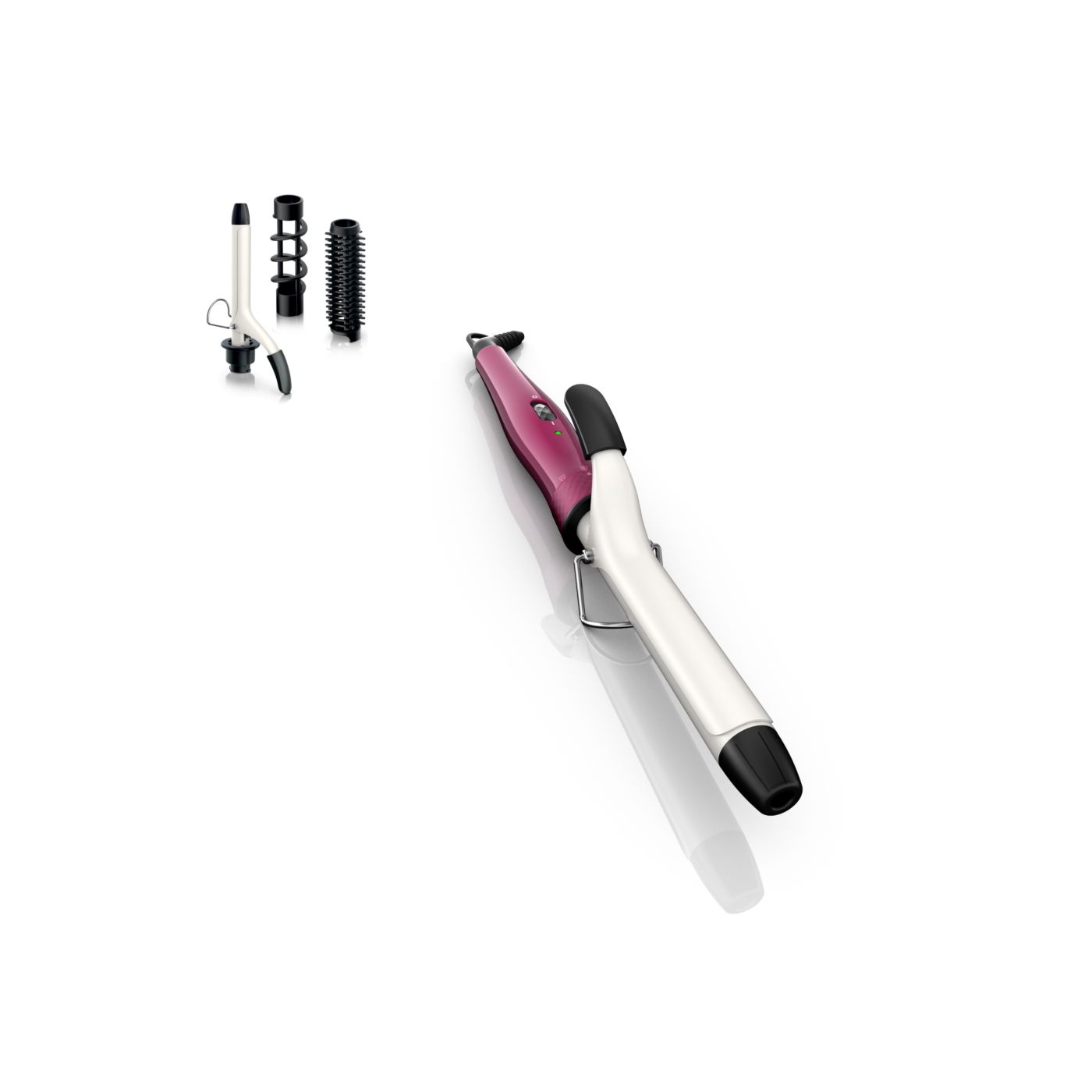 El Multi-curler de Philips incluye: pinza de 16 mm para bucles, accesorio con cepillo para pinza de 16 mm para dar volumen adicional, pinza de 22 mm para rizar y accesorio con cepillo para crear rulos grandes y hermosas ondas.