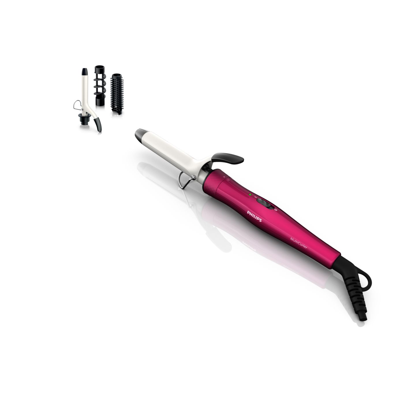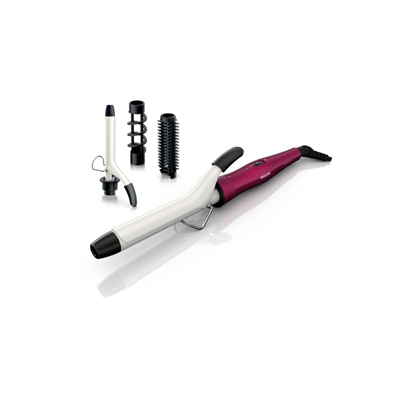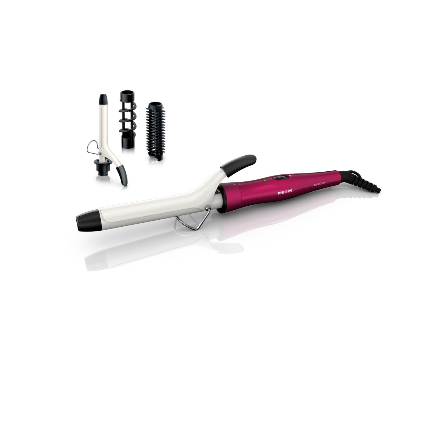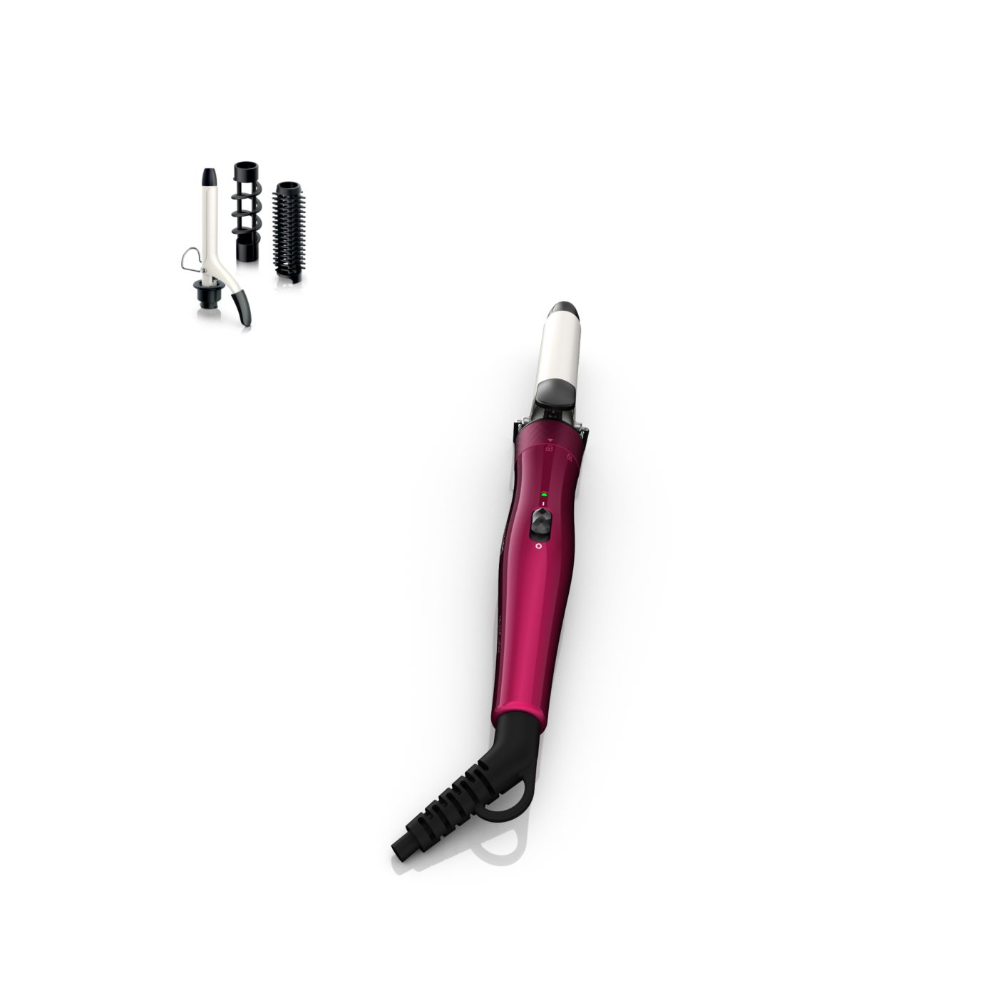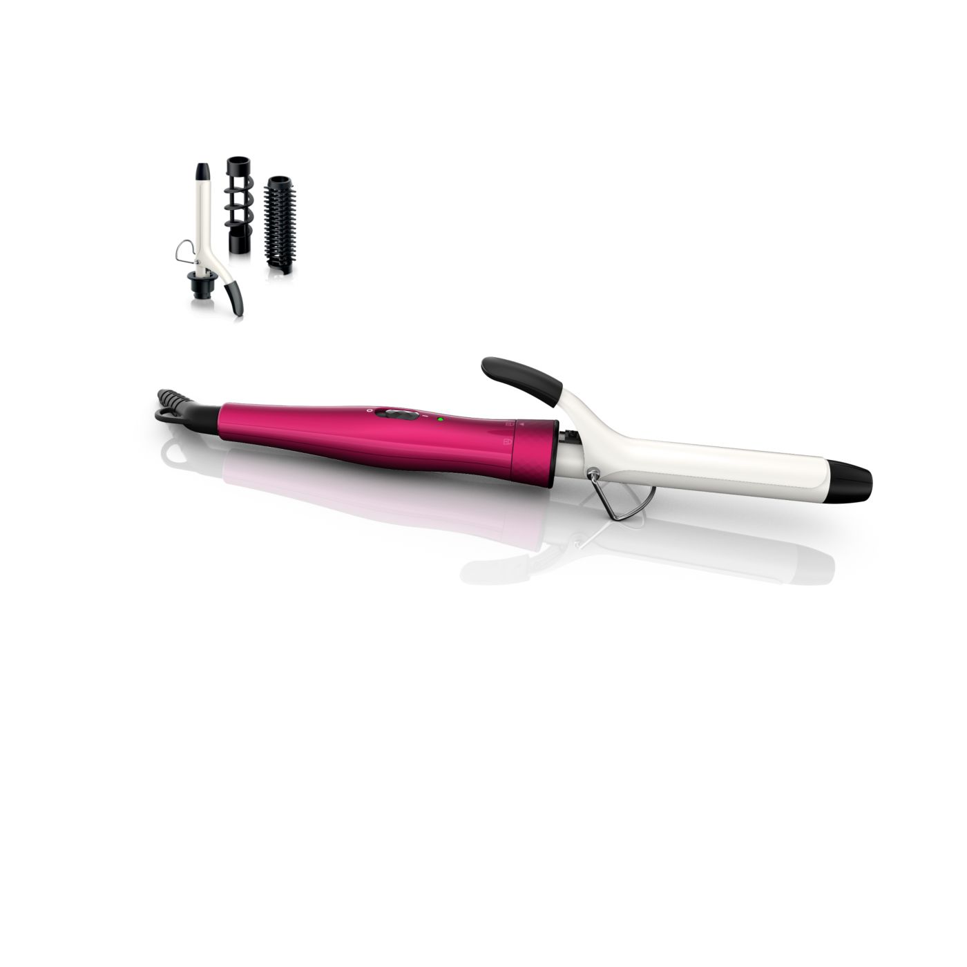 El Multi-curler de Philips incluye: pinza de 16 mm para bucles, accesorio con cepillo para pinza de 16 mm para dar volumen adicional, pinza de 22 mm para rizar y accesorio con cepillo para crear rulos grandes y hermosas ondas.