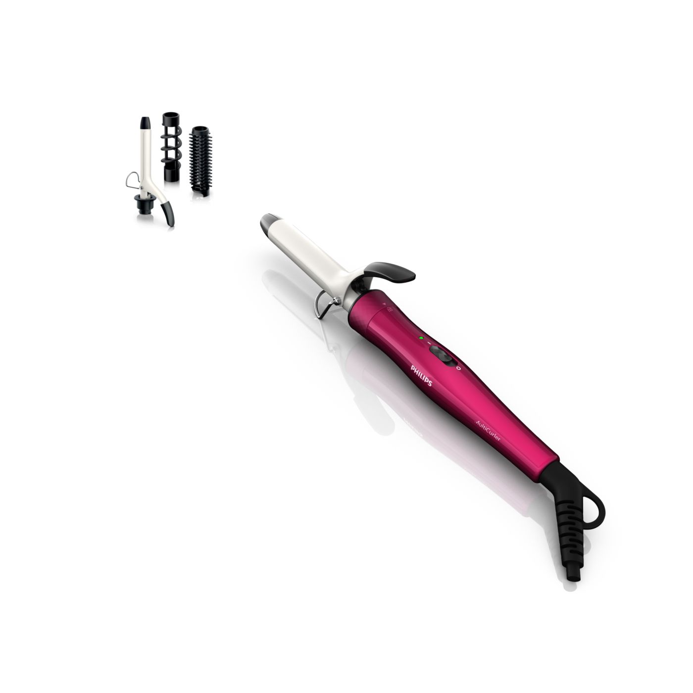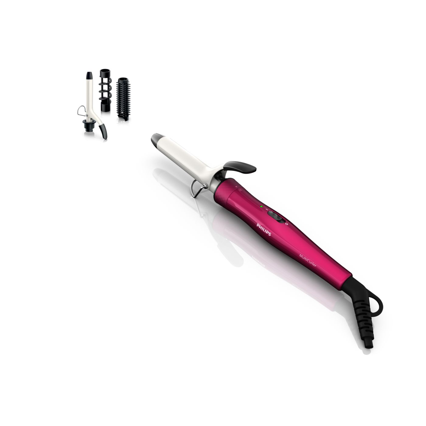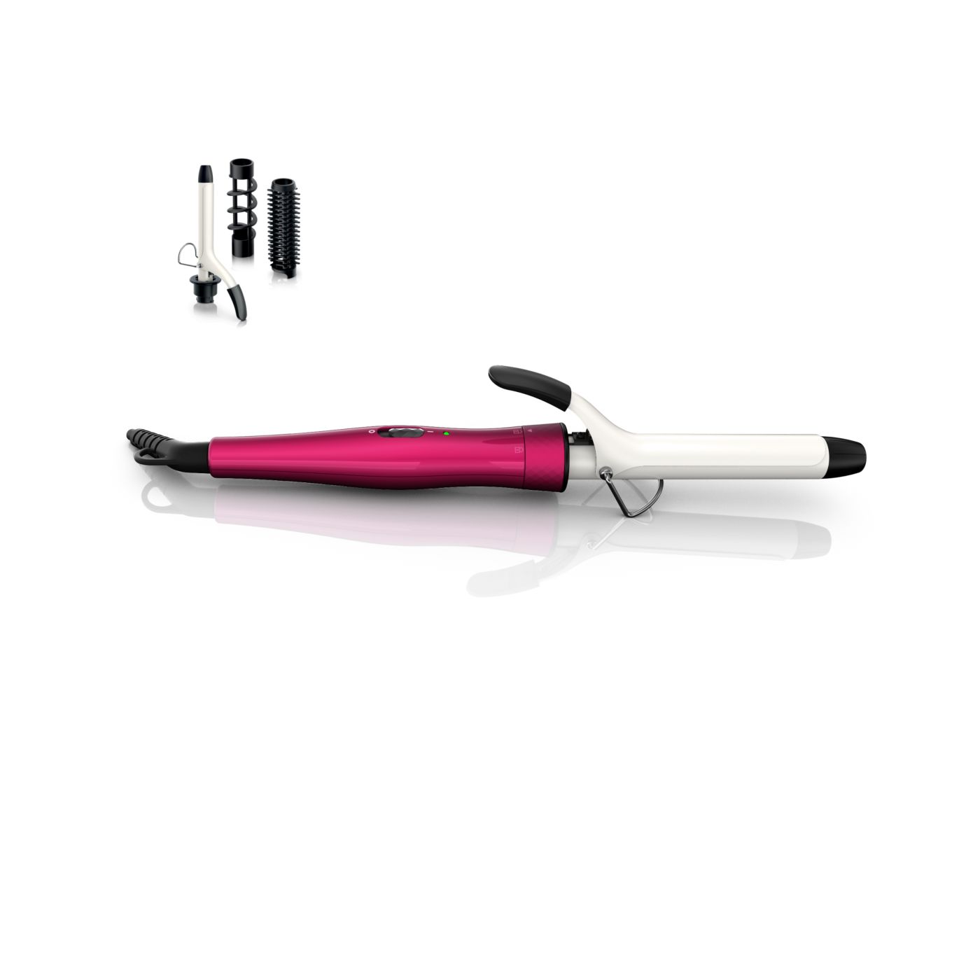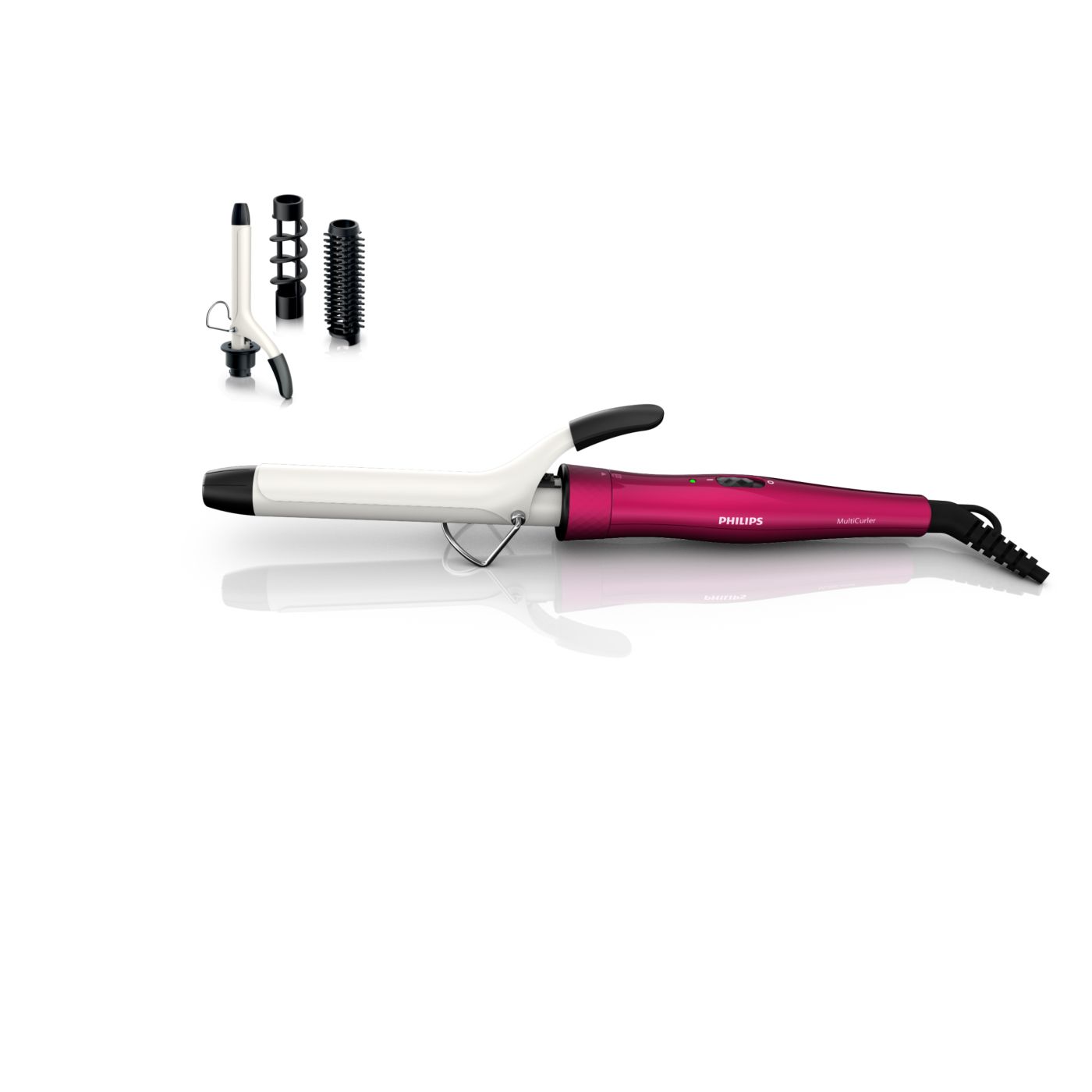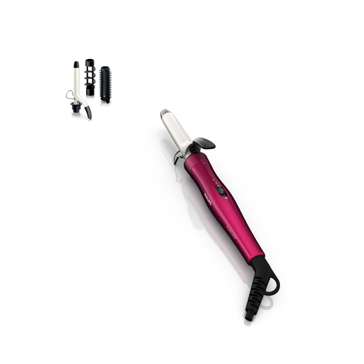 El Multi-curler de Philips incluye: pinza de 16 mm para bucles, accesorio con cepillo para pinza de 16 mm para dar volumen adicional, pinza de 22 mm para rizar y accesorio con cepillo para crear rulos grandes y hermosas ondas.