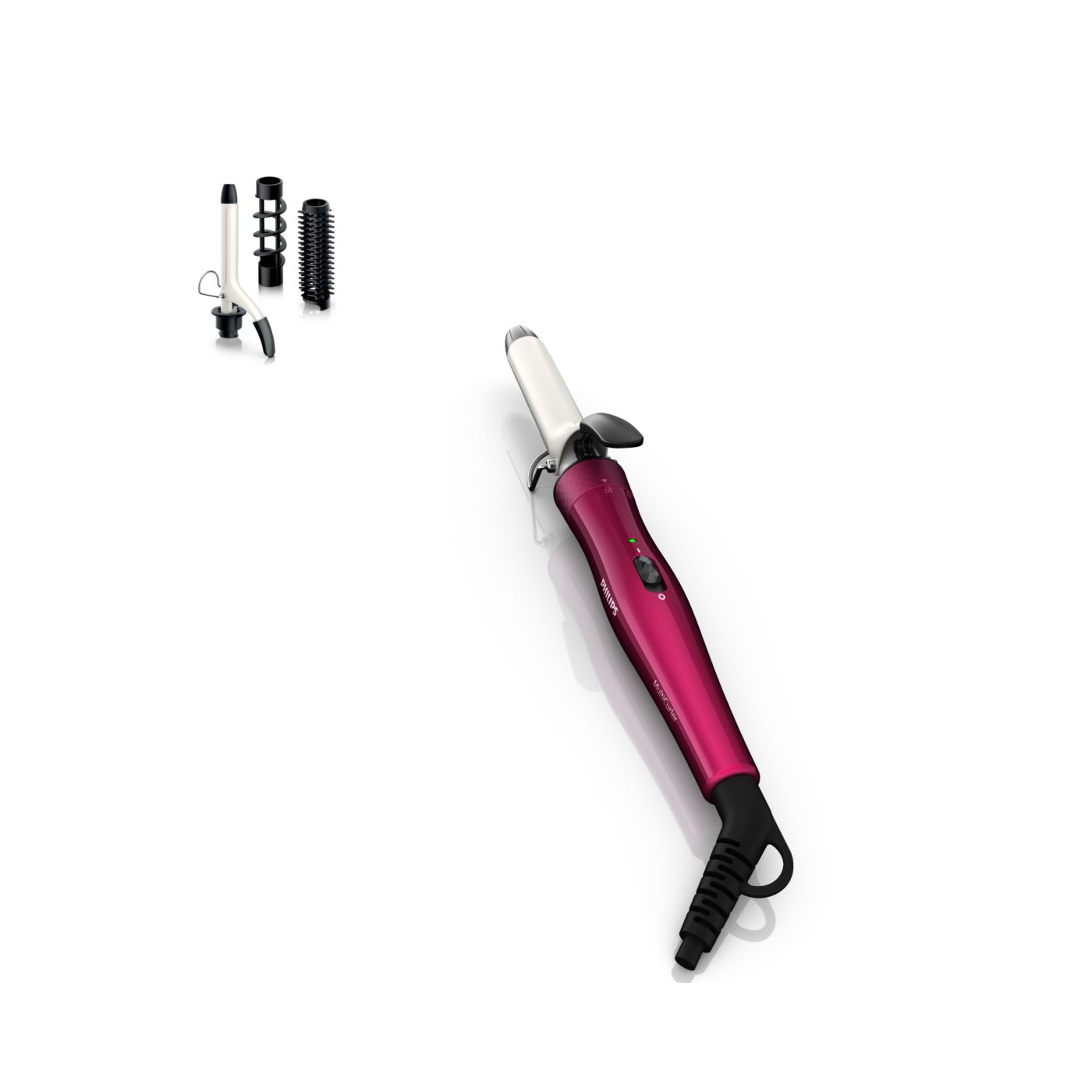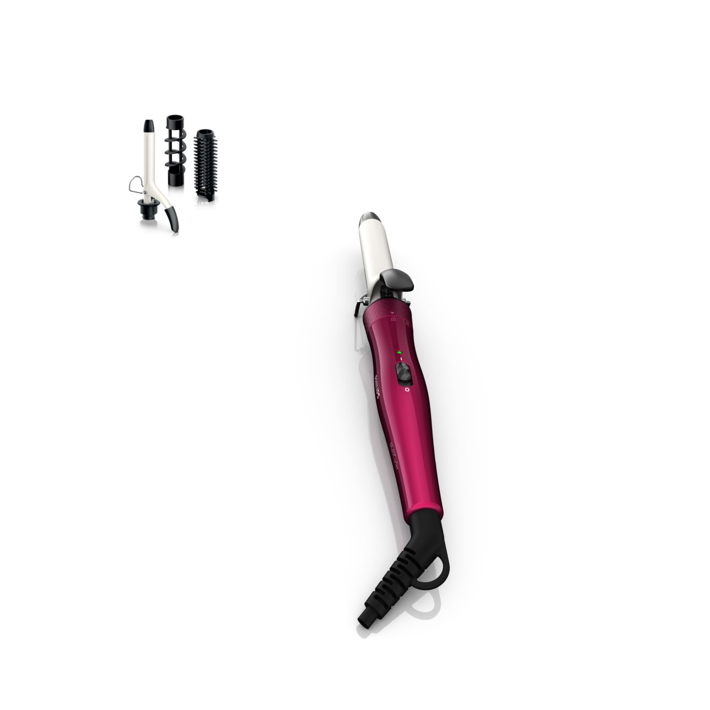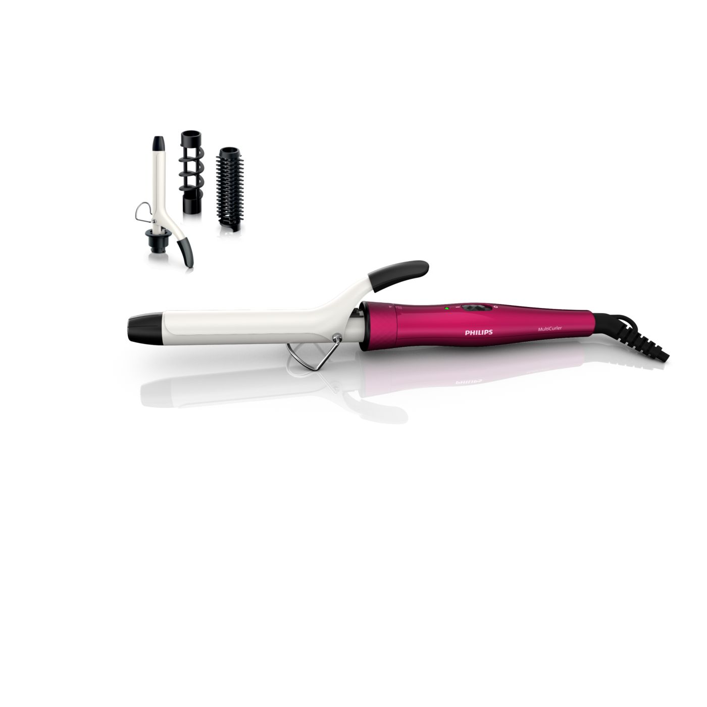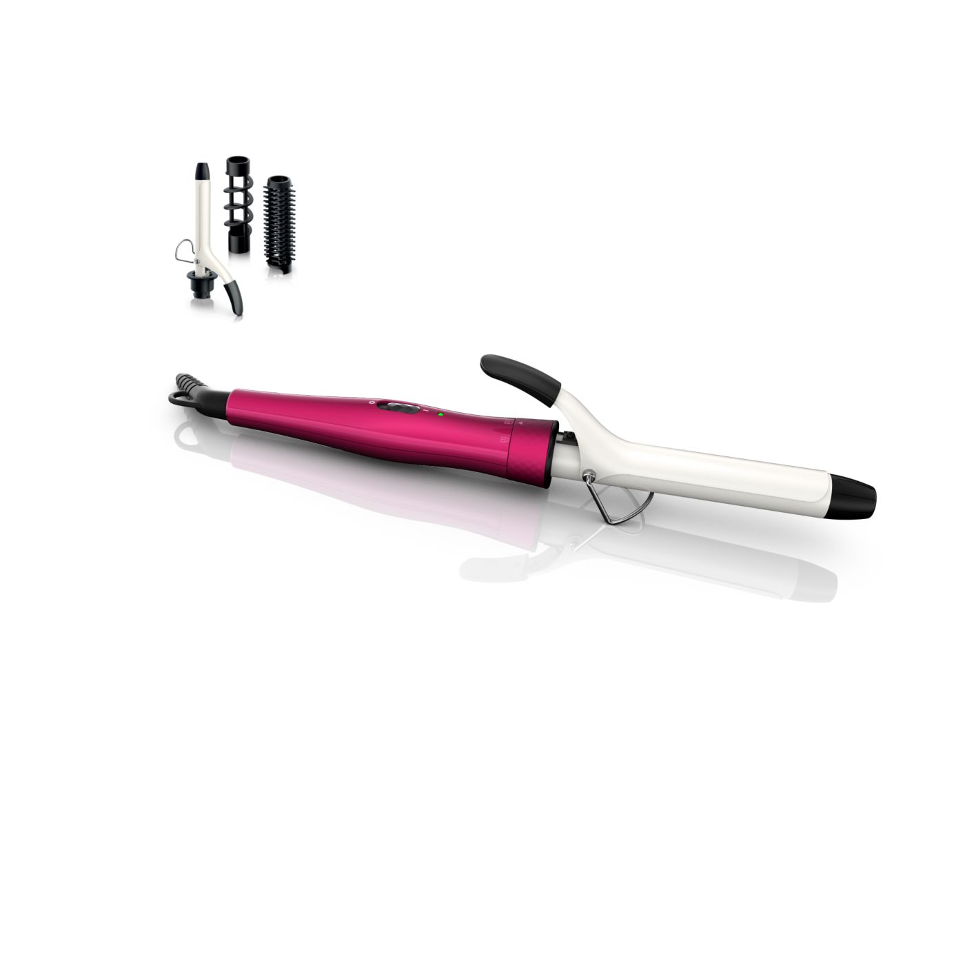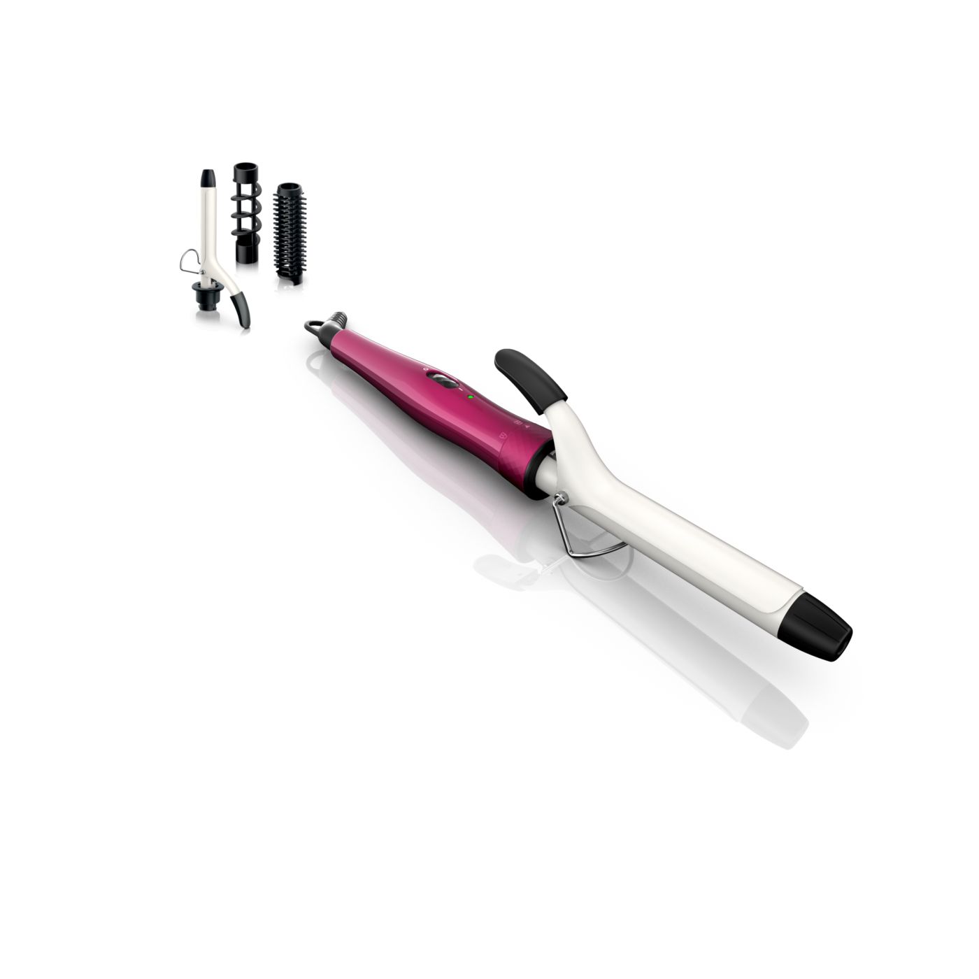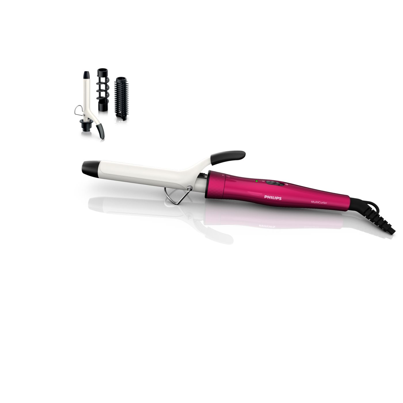 El Multi-curler de Philips incluye: pinza de 16 mm para bucles, accesorio con cepillo para pinza de 16 mm para dar volumen adicional, pinza de 22 mm para rizar y accesorio con cepillo para crear rulos grandes y hermosas ondas.