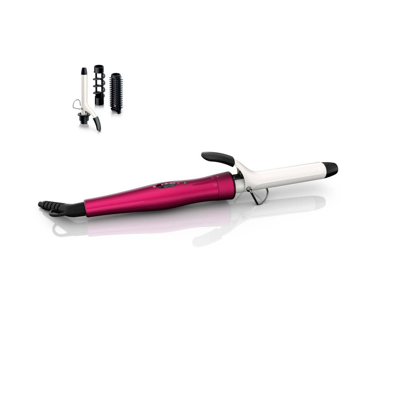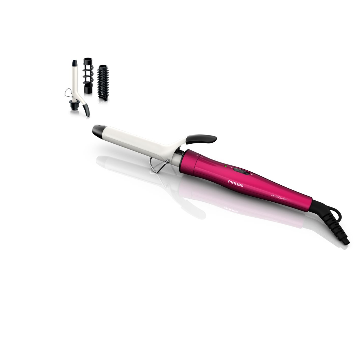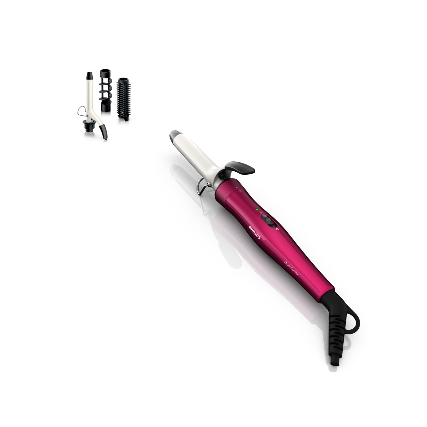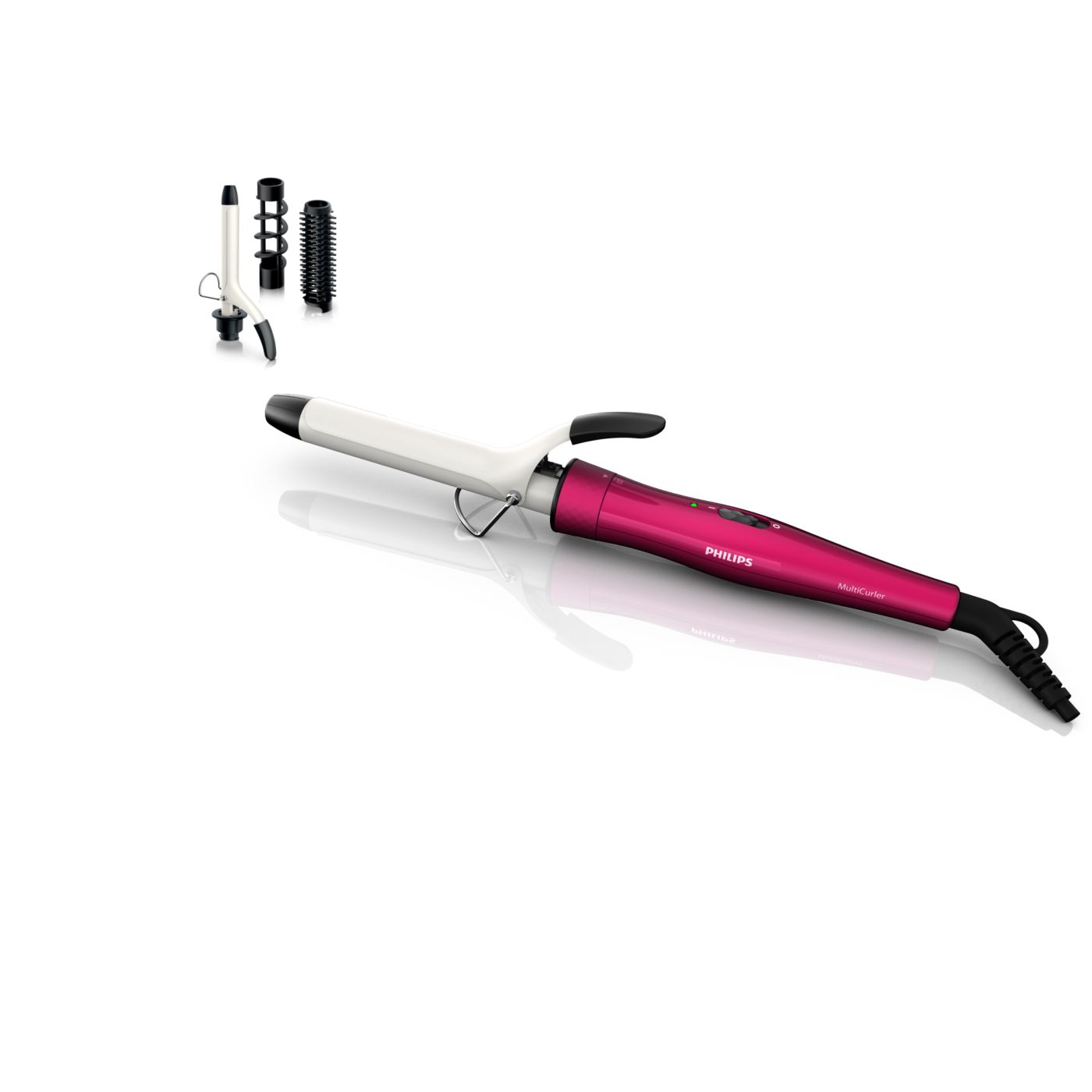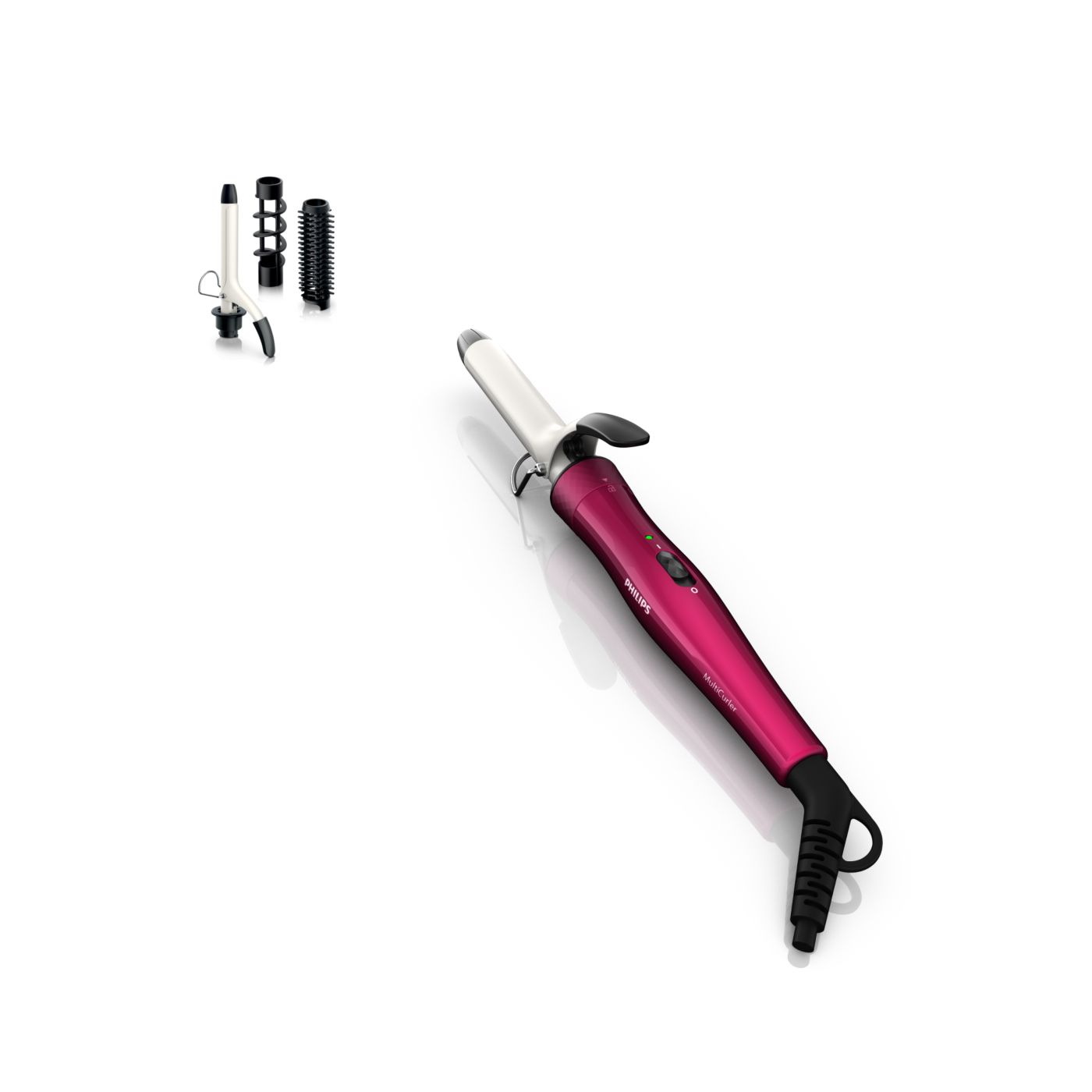 El Multi-curler de Philips incluye: pinza de 16 mm para bucles, accesorio con cepillo para pinza de 16 mm para dar volumen adicional, pinza de 22 mm para rizar y accesorio con cepillo para crear rulos grandes y hermosas ondas.