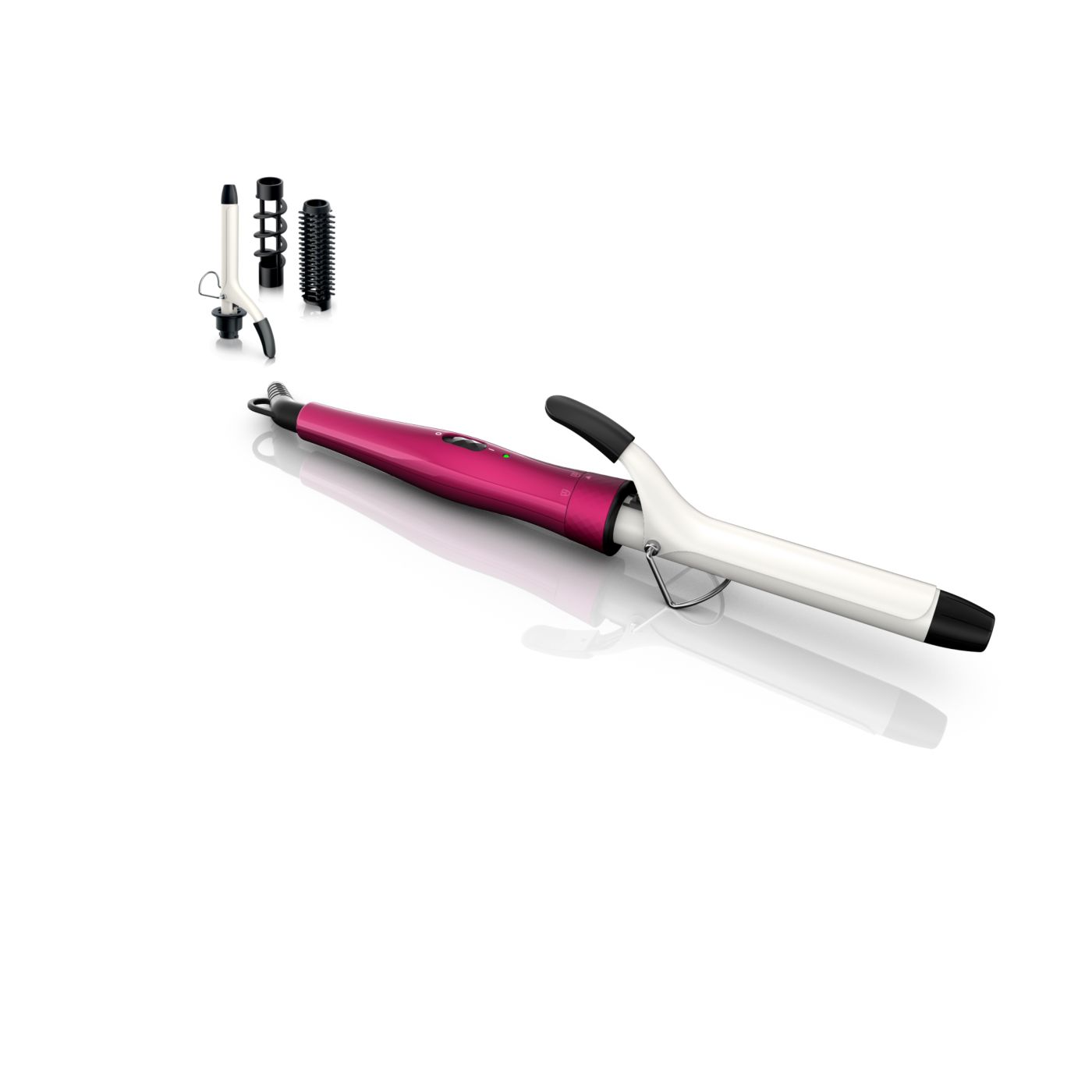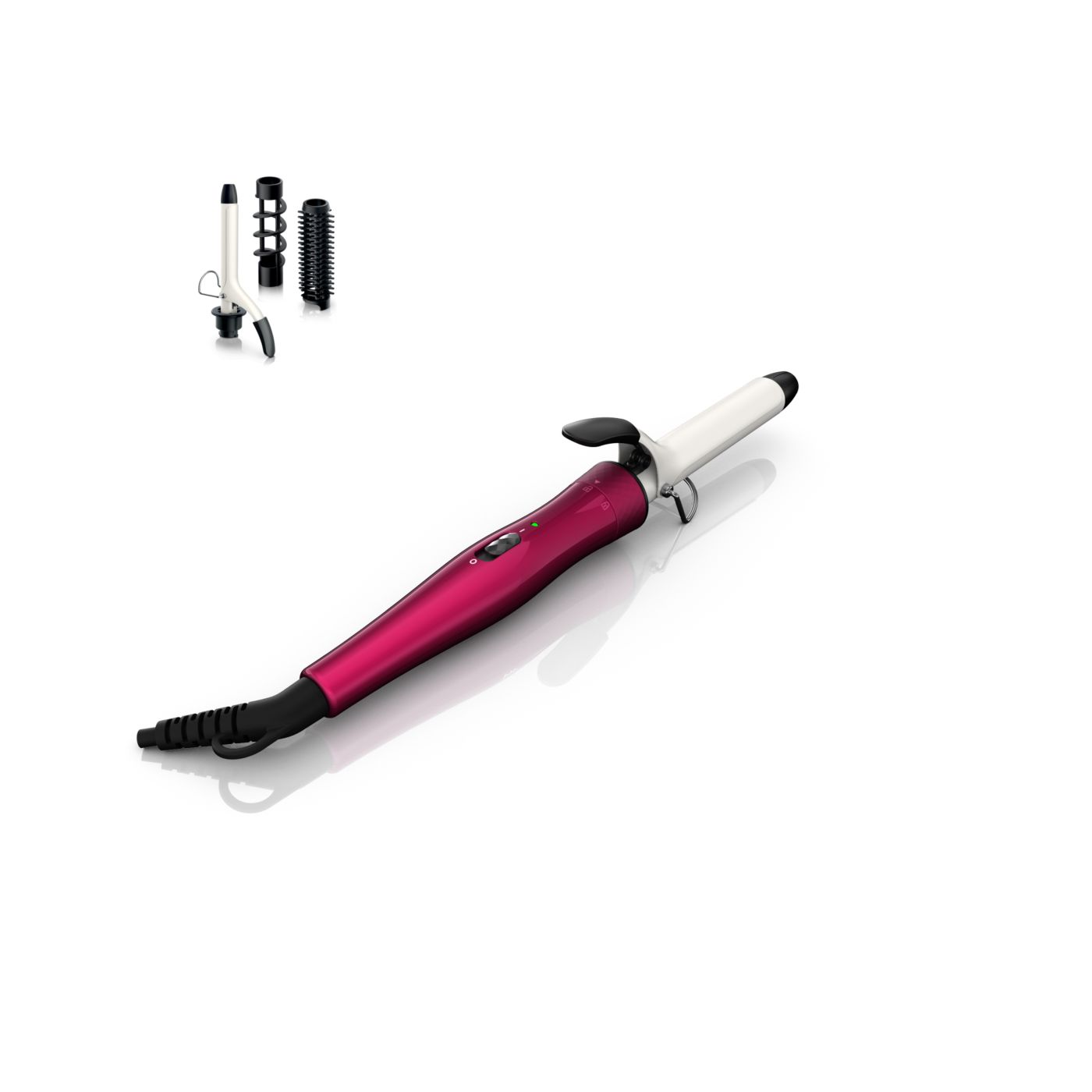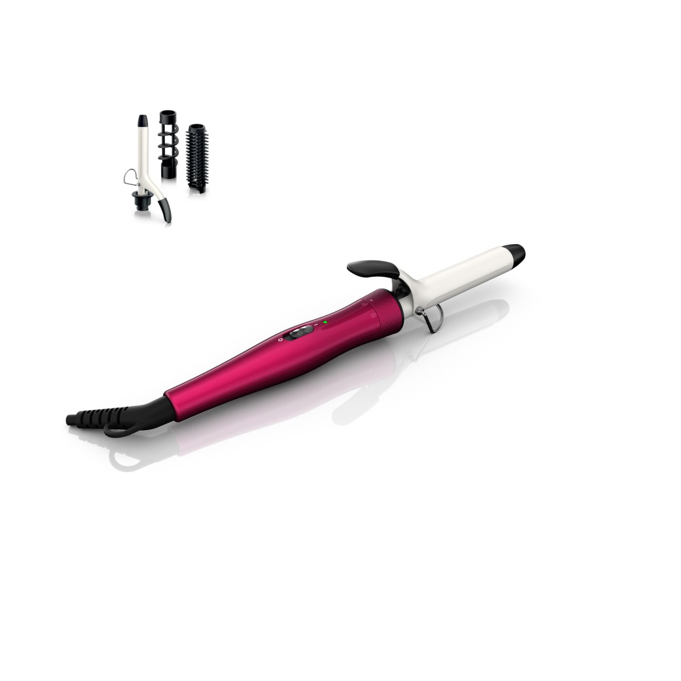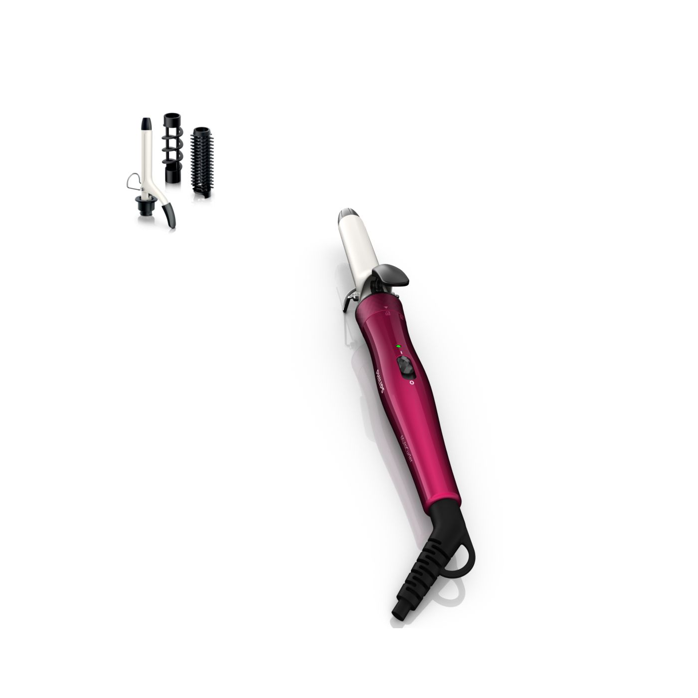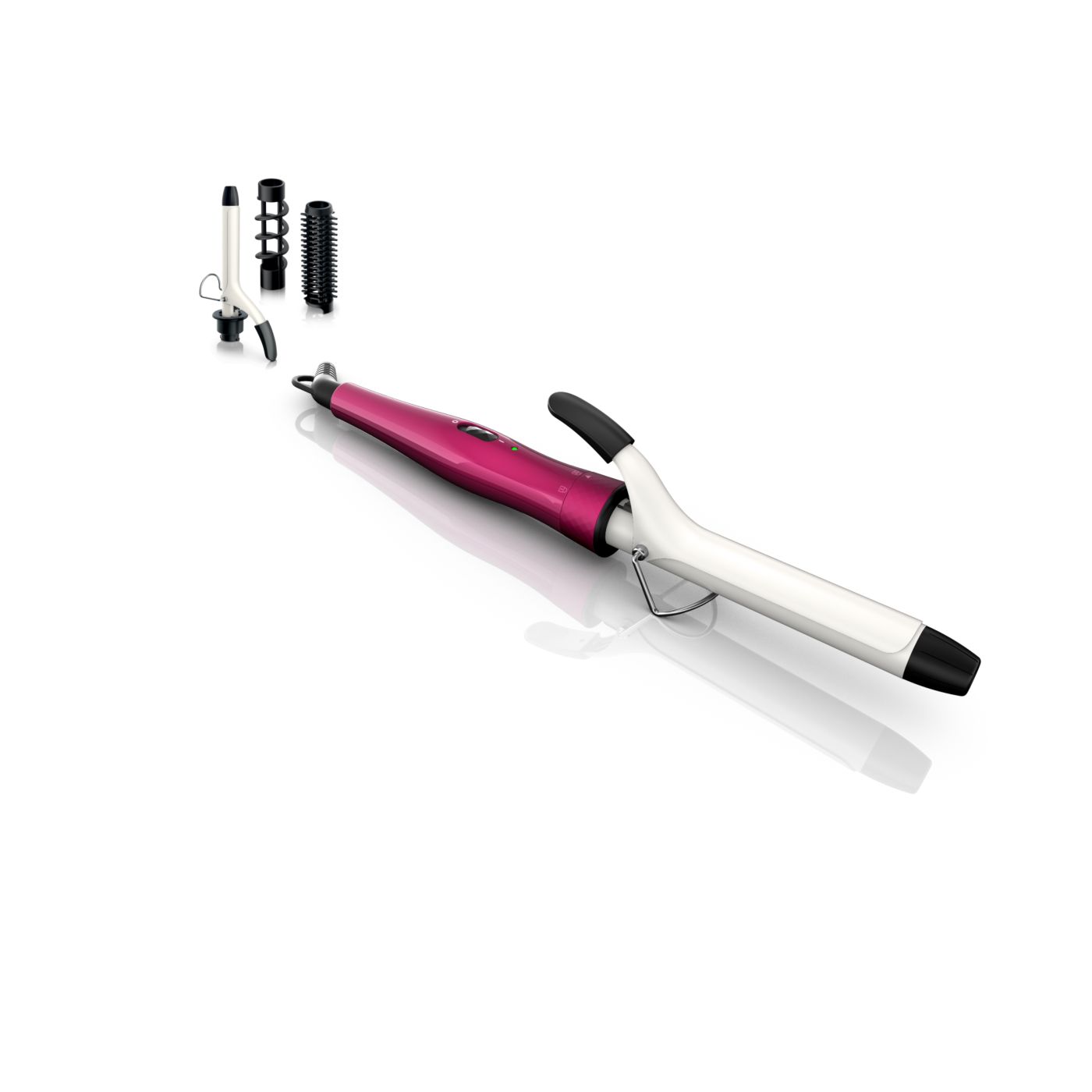 El Multi-curler de Philips incluye: pinza de 16 mm para bucles, accesorio con cepillo para pinza de 16 mm para dar volumen adicional, pinza de 22 mm para rizar y accesorio con cepillo para crear rulos grandes y hermosas ondas.