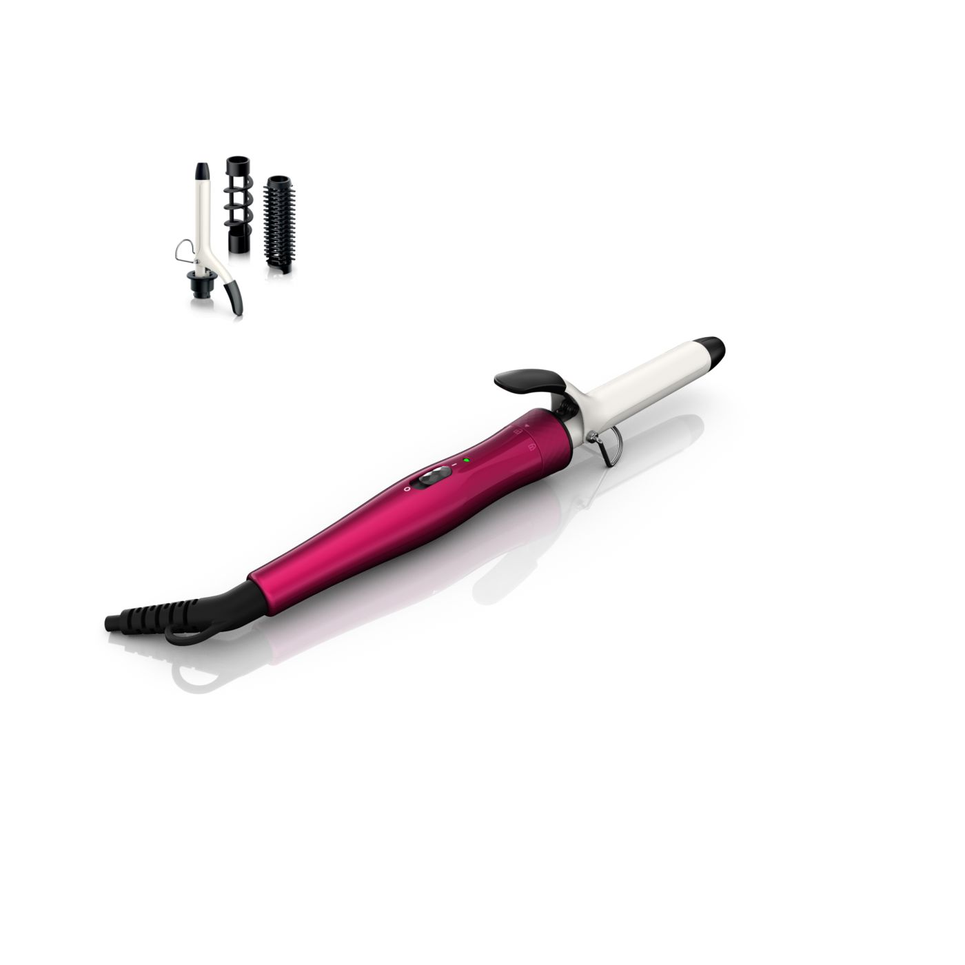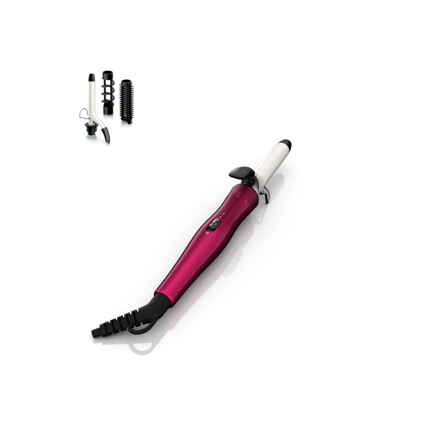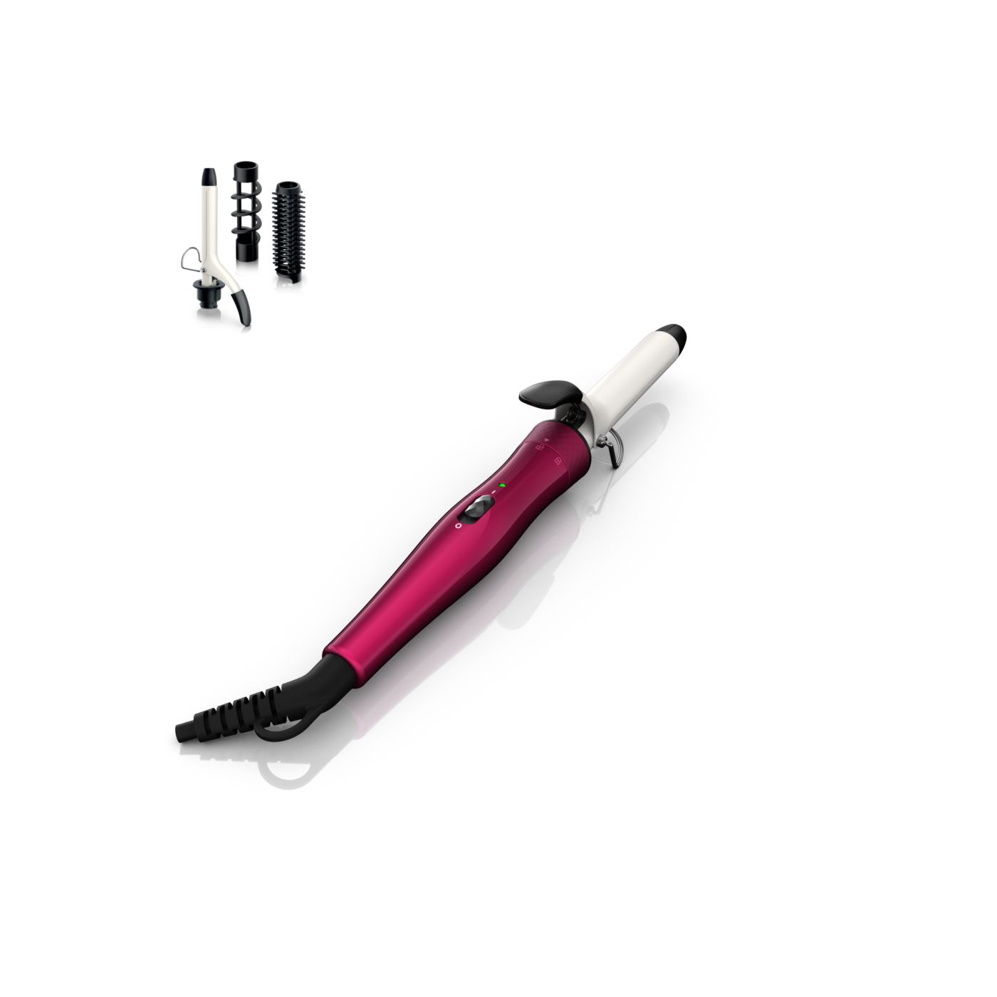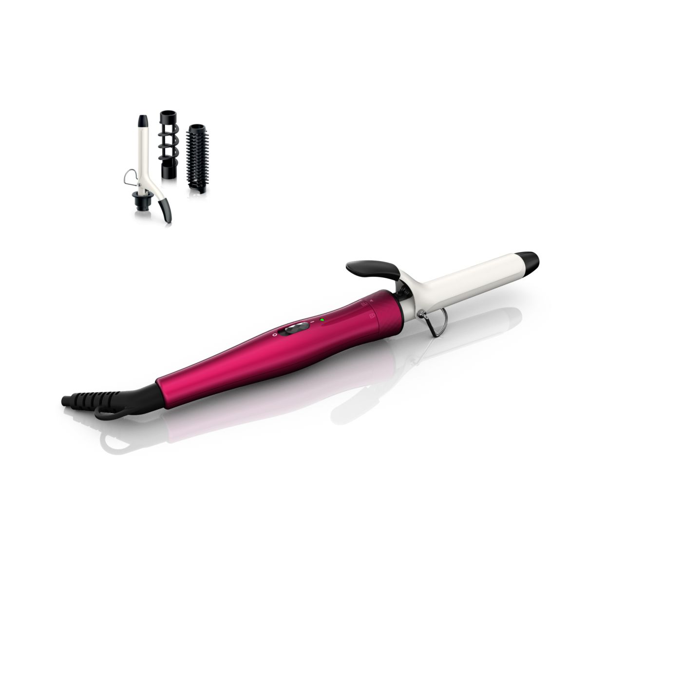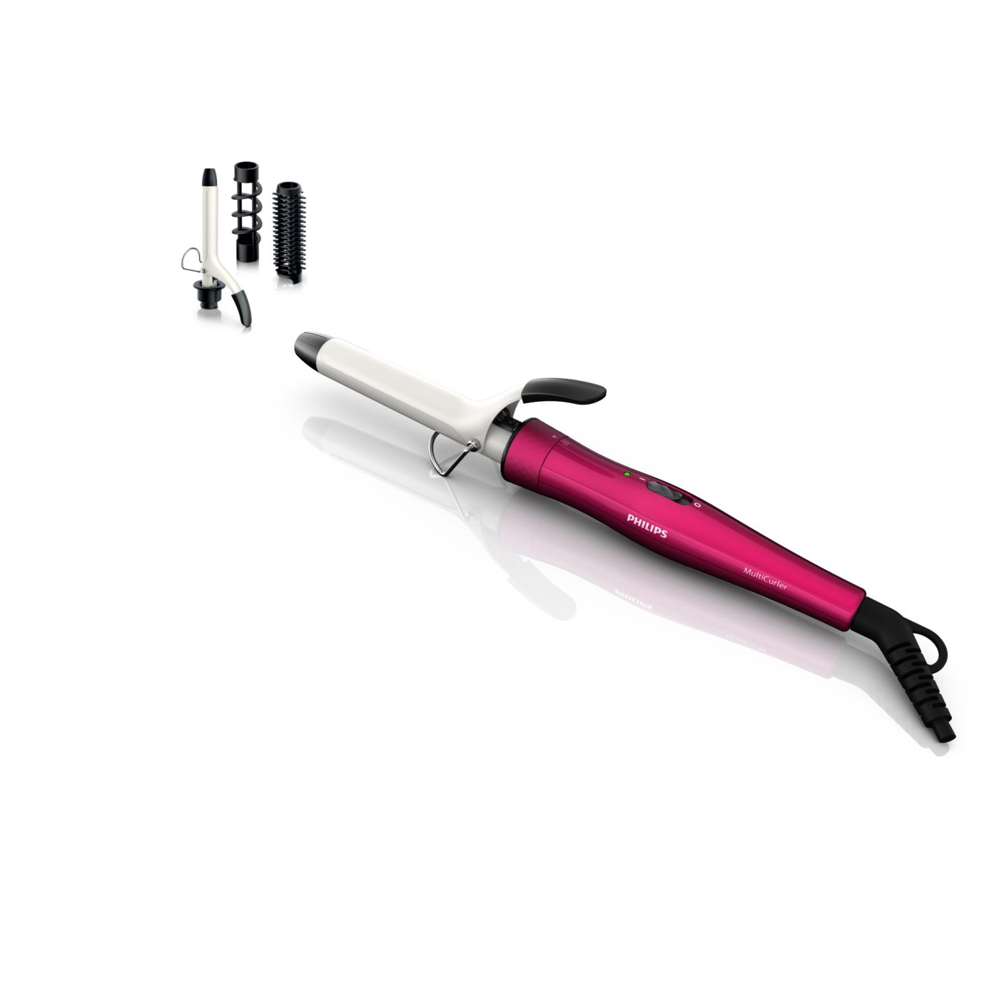 El Multi-curler de Philips incluye: pinza de 16 mm para bucles, accesorio con cepillo para pinza de 16 mm para dar volumen adicional, pinza de 22 mm para rizar y accesorio con cepillo para crear rulos grandes y hermosas ondas.